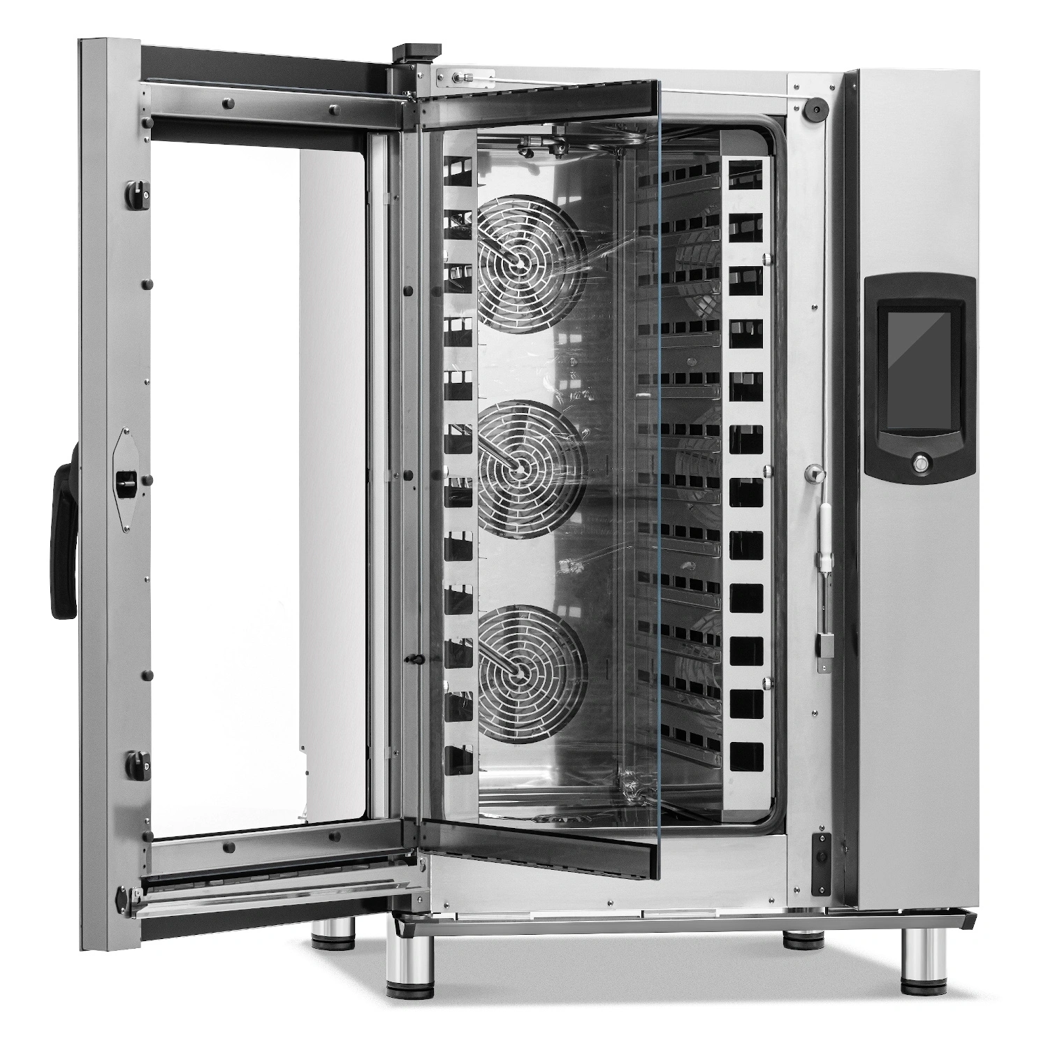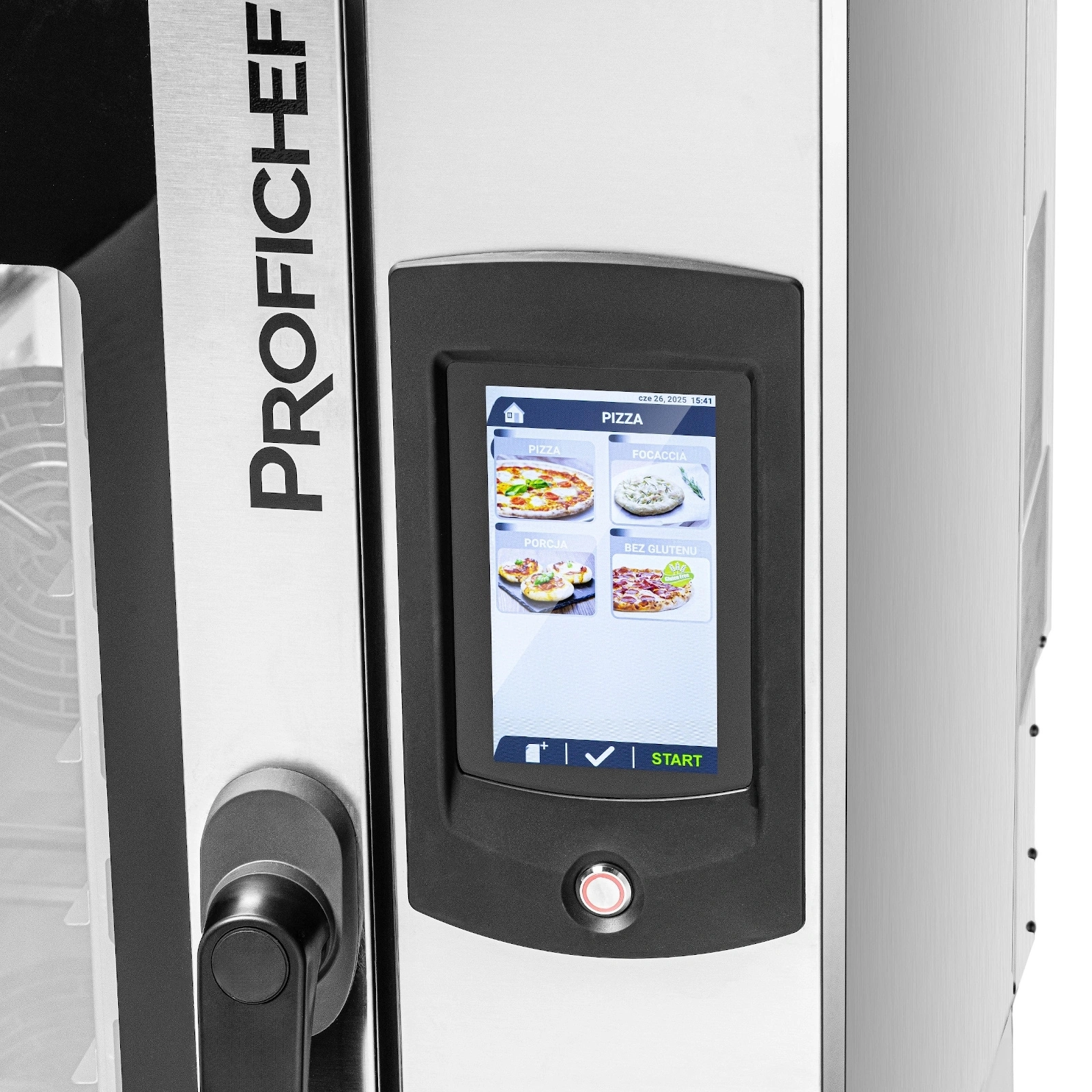 Piec konwekcyjno-parowy elektryczny Omega 12 GN 1/1 PROFICHEF PCO211012 to nowoczesne urządzenie gastronomiczne przeznaczone do profesjonalnych kuchni, takich jak restauracje, hotele czy stołówki. Wyróżnia się bardzo dużą pojemnością – umożliwia jednoczesne przygotowanie potraw w 12 pojemnikach GN 1/1, a także precyzyjną kontrolą temperatury i wilgotności. Intuicyjny, dotykowy panel sterowania oraz szerokie możliwości programowania znacząco ułatwiają pracę w kuchniach o dużym natężeniu produkcji.