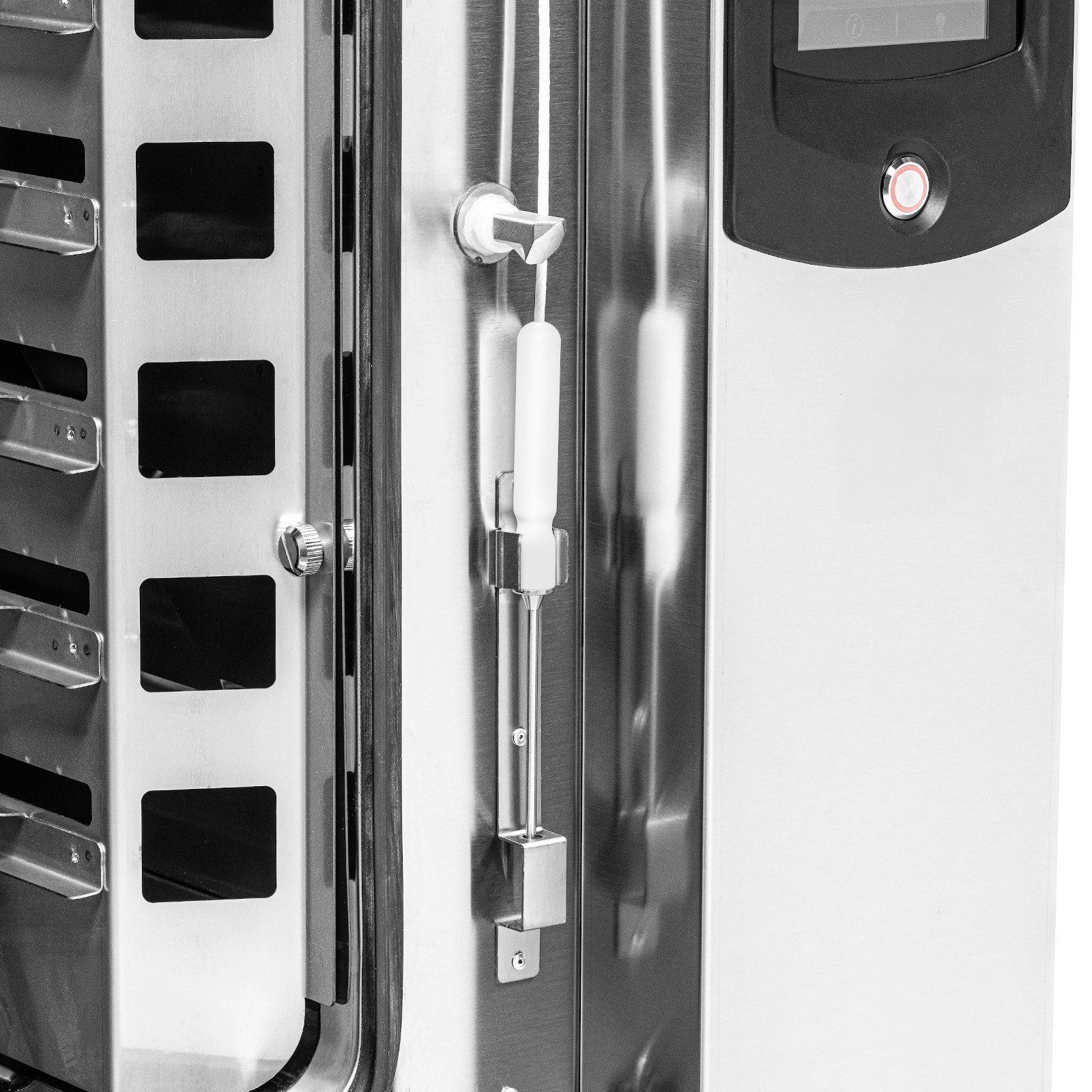 Piec dostarczany jest bez pojemników GN i przewodu zasilającego, co umożliwia indywidualne dopasowanie wyposażenia do potrzeb lokalu. W zestawie znajduje się kompletny system automatycznego mycia, sonda 3-punktowa z możliwością podłączenia drugiej sondy oraz intuicyjny panel sterowania LCD w języku polskim. Dodatkowo piec posiada wbudowany system Android z łącznością WiFi, co umożliwia łatwe zarządzanie przepisami i zdalne aktualizacje.