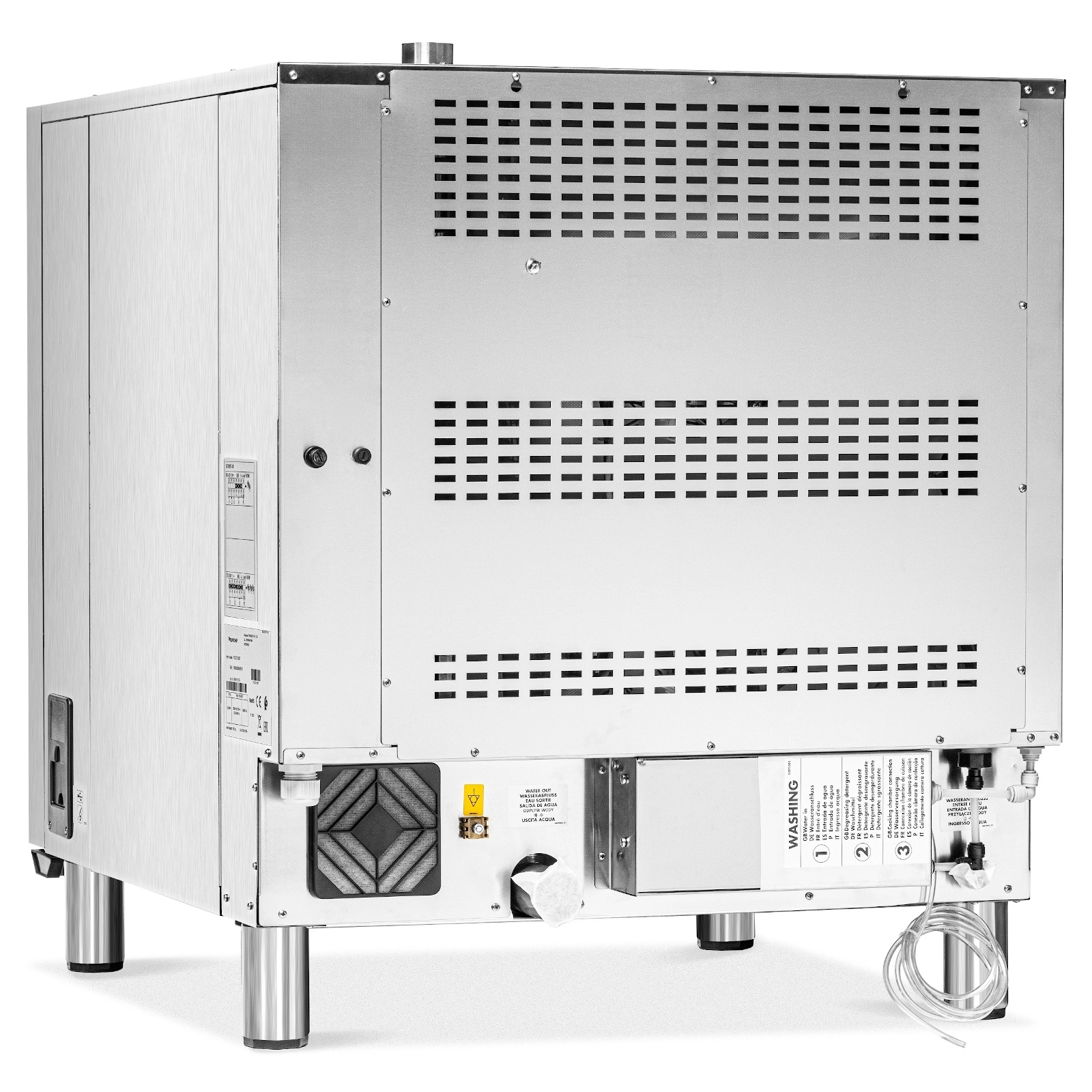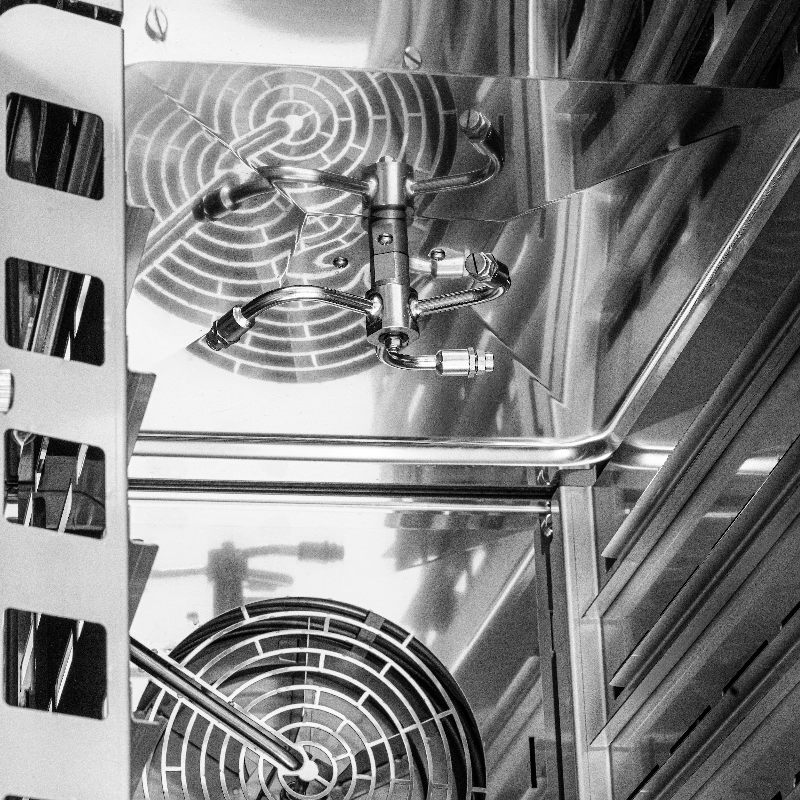 Urządzenie wykonano z wysokogatunkowej stali nierdzewnej AISI 304, co zapewnia odporność na korozję i łatwość utrzymania w czystości. Komora z tłoczonym wnętrzem oraz zaokrąglonymi narożnikami umożliwia szybkie mycie, a odpływ w dnie skutecznie odprowadza nadmiar płynów. Drzwi z podwójnym przeszkleniem i grawitacyjnym chłodzeniem zwiększają bezpieczeństwo i komfort użytkowania, minimalizując ryzyko poparzeń. Piec wyposażono w system automatycznego chłodzenia komory, co umożliwia bezpieczną i szybką zmianę trybu pracy, a także port USB do aktualizacji oprogramowania i zarządzania przepisami.