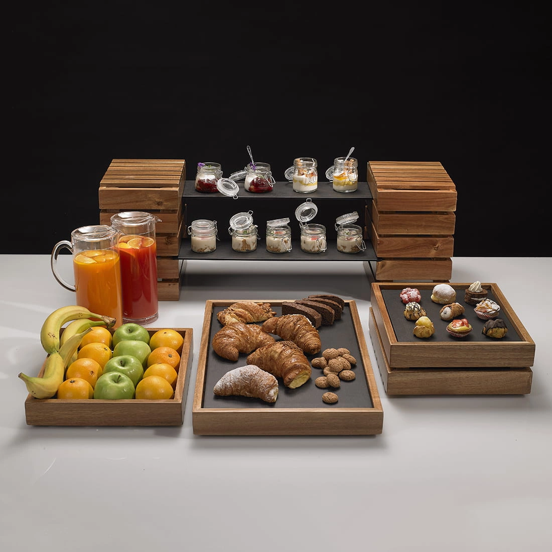 Płyta melaminowa czarna LEONE GN 1/2 to funkcjonalne i eleganckie rozwiązanie do serwowania przekąsek, wędlin, plastrów sera oraz małych porcji dań. Wykonana z wysokiej jakości melaminy, płyta charakteryzuje się wyjątkową trwałością i odpornością na uszkodzenia, zapewniając komfortową obsługę podczas serwowania w bufetach. Jej prostokątny kształt oraz uniwersalny czarny kolor sprawiają, że doskonale pasuje do zestawów bufetowych wykonanych z drewna akacjowego LEONE, tworząc spójną, elegancką kompozycję.