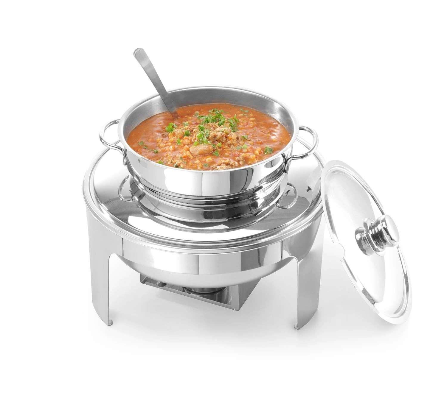 Podgrzewacz stołowy do zup na pastę. Pojemność 10 l. Podgrzewany paliwem. Wykonany w całości ze stali nierdzewnej wysokopolerowanej. W wyposażeniu pojemnik na wodę, okrągły pojemnik na zupę oraz puszka na paliwo. Pokrywa pojemnika z wycięciem na chochelkę.