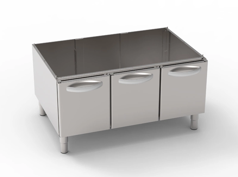 Wytrzymała i pojemna podstawa z szafką 3-drzwiową z linii T-90, przeznaczona do ustawiania nastawnych urządzeń grzewczych Tecnoinox o wymiarach 120x90x28 cm. Szafka o wymiarach 120 × 76,5 × 57 cm zapewnia dodatkową przestrzeń na akcesoria i optymalizuje organizację miejsca w kuchni profesjonalnej.