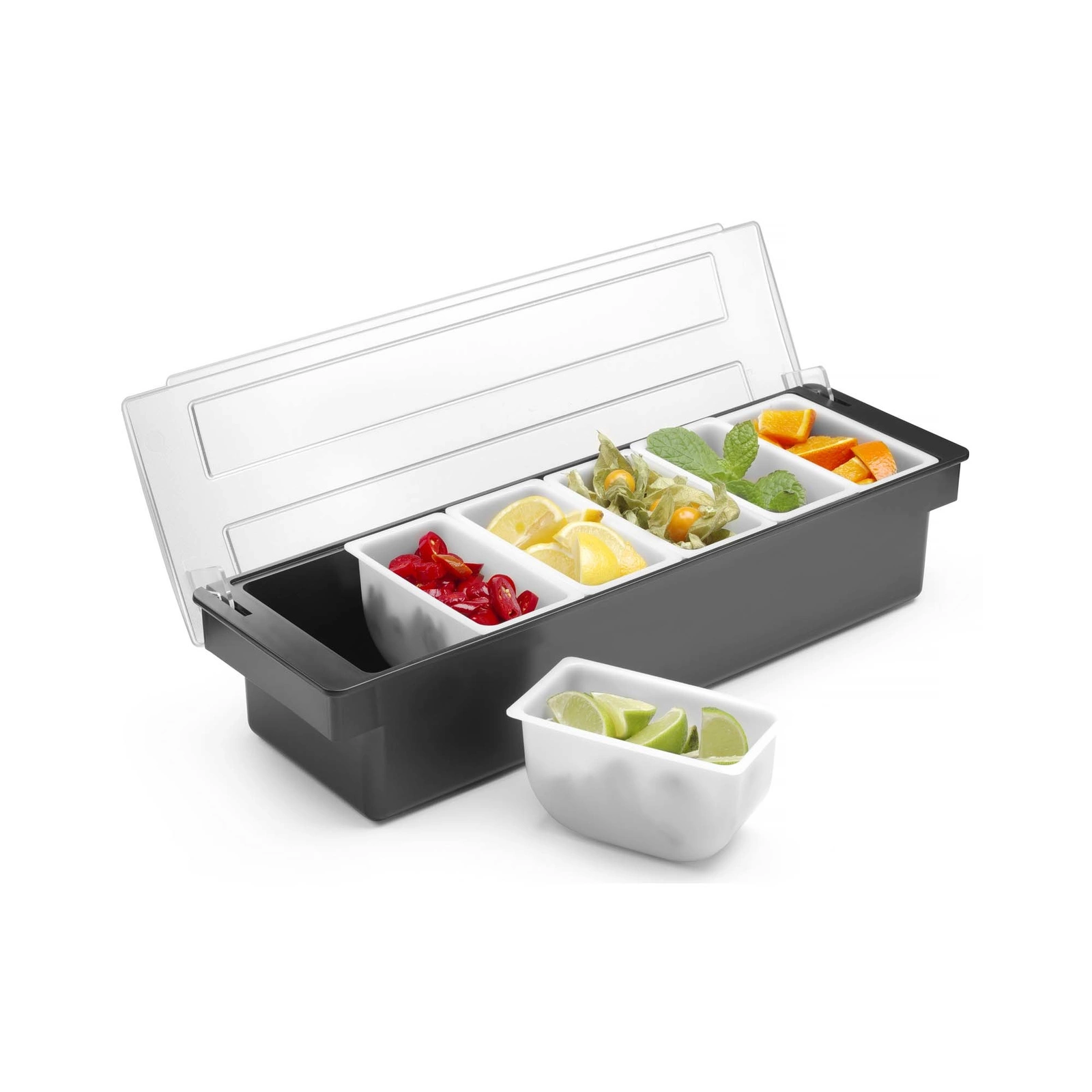 Pojemnik barmański marki BarUp to praktyczne i funkcjonalne narzędzie, które dzięki sześciu oddzielnym wkładom umożliwia przechowywanie różnych dodatków do drinków, takich jak owoce czy przyprawy, w sposób uporządkowany i higieniczny.