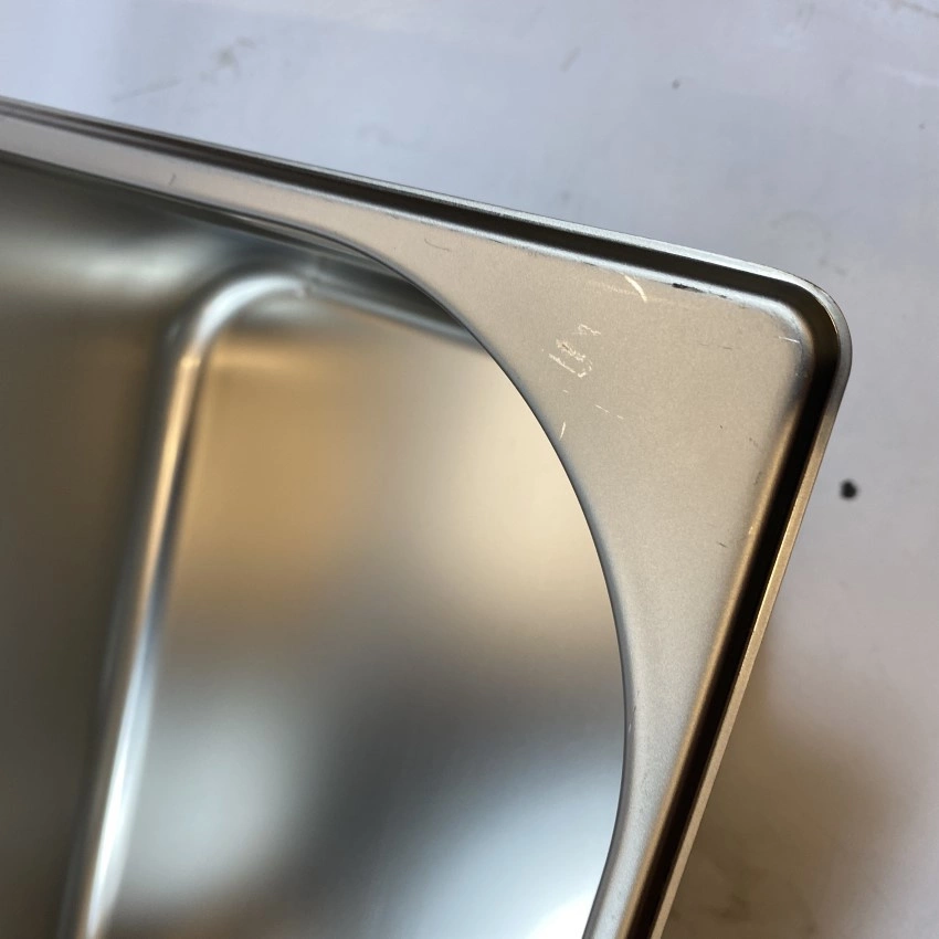 Pojemnik pochodzi z ekspozycji- posiada rysy oraz na narożnikach widoczne wady- nierówności i zagięcia.