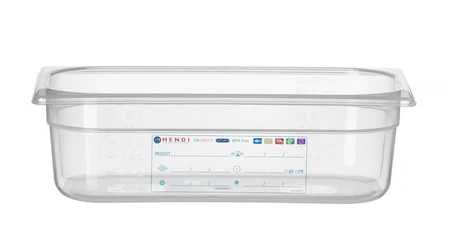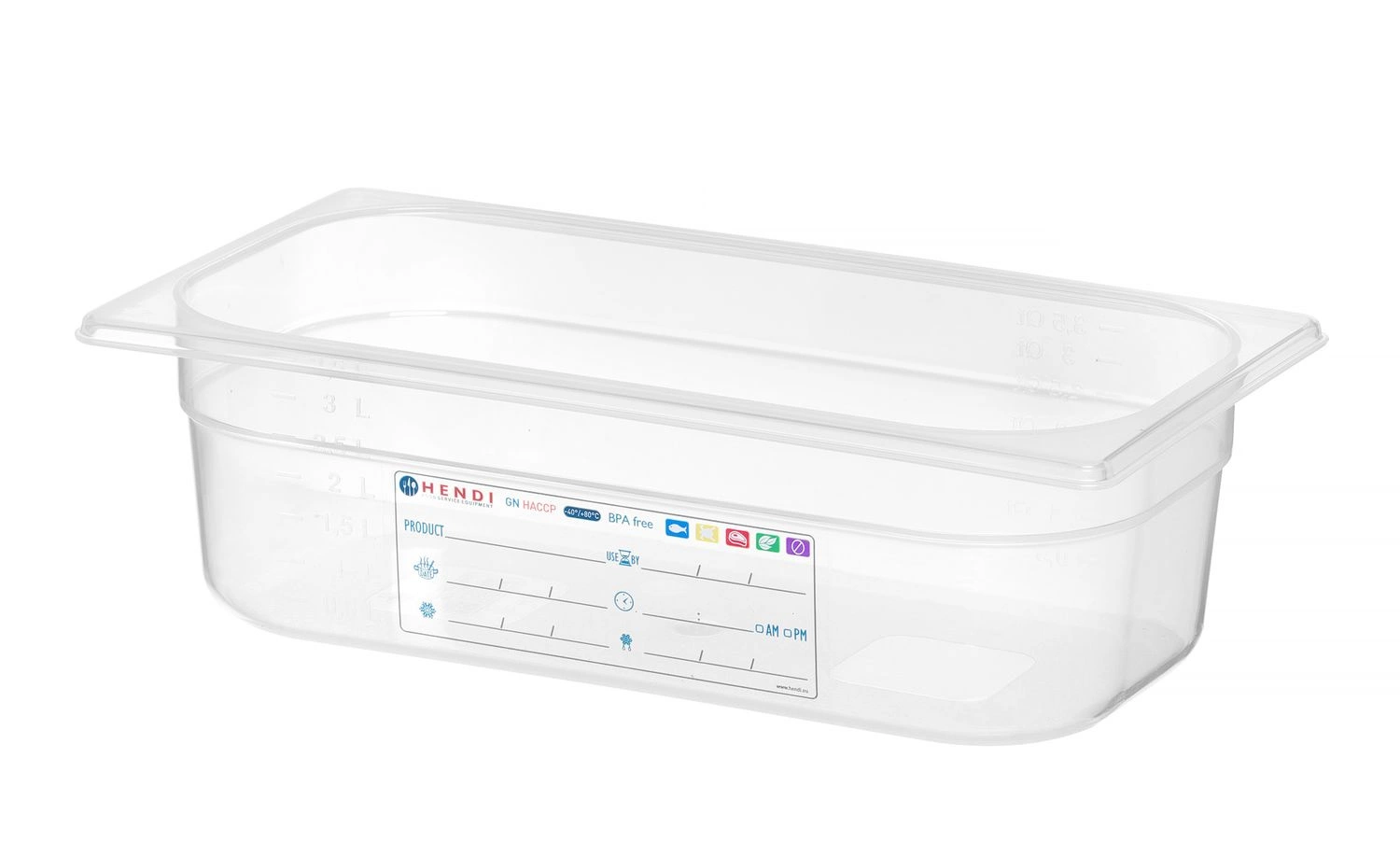 Pojemnik GN 1/3 HACCP o głębokości 10 cm wykonany z przezroczystego polipropylenu. Wtopiona w tworzywo etykieta do monitorowania procesu magazynowania. Nie wchłania zapachów ani smaków.