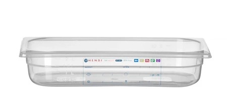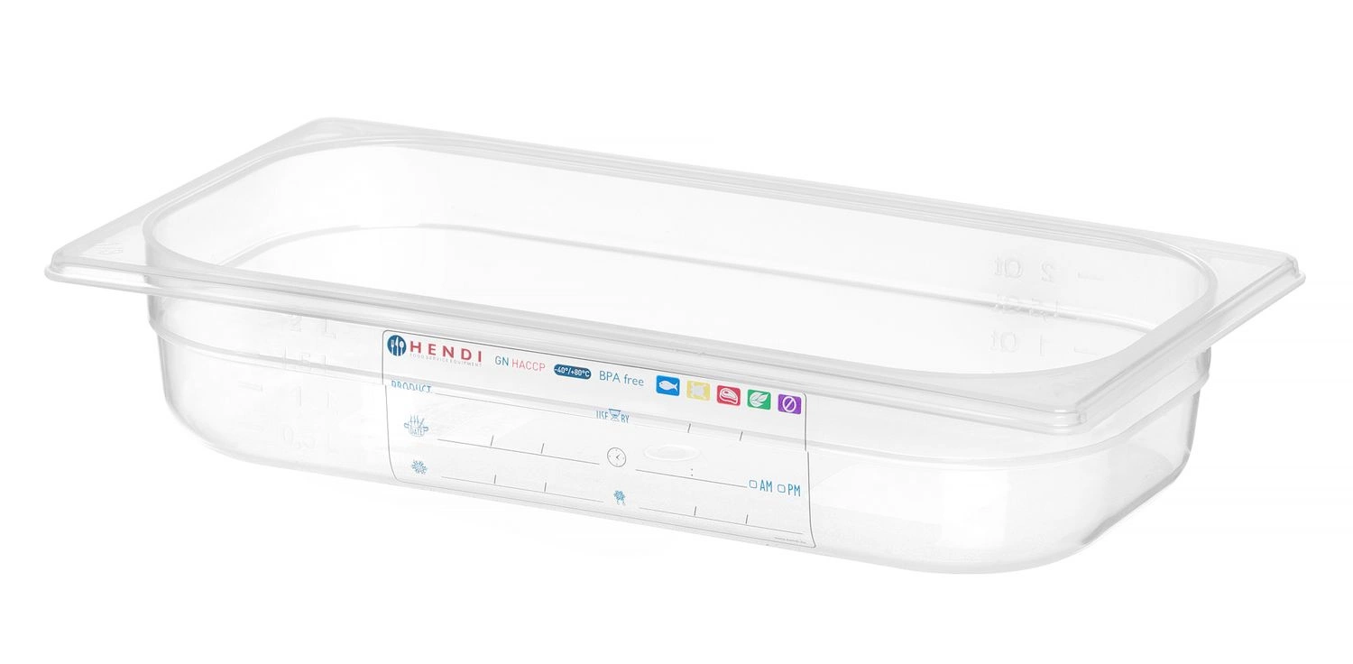 Pojemnik GN 1/3 HACCP o głębokości 6,5 cm wykonany z przezroczystego polipropylenu.  Wtopiona w tworzywo etykieta do monitorowania procesu magazynowania. Nie wchłania zapachów ani smaków.