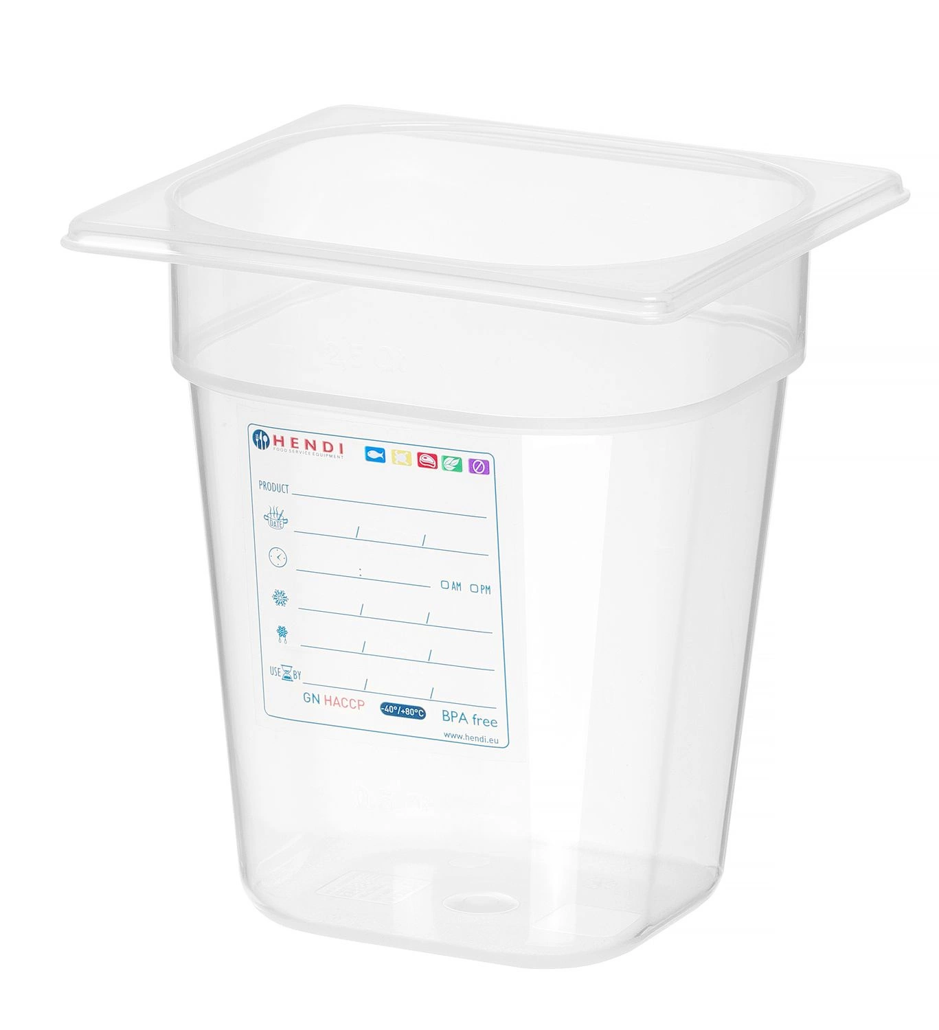 Pojemnik GN 1/6 HACCP o głębokości 20 cm wykonany z przezroczystego polipropylenu. Wtopiona w tworzywo etykieta do monitorowania procesu magazynowania. Nie wchłania zapachów ani smaków.