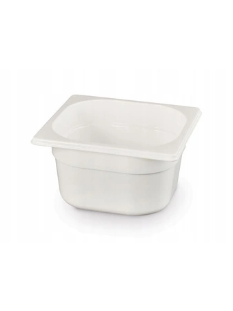 Pojemnik GN 1/6 o głębokości 6,5 cm wykonany z białego poliwęglanu. Nie wchłania smaków i zapachów. Odporność na temperaturę w zakresie od -40 do +99oC.