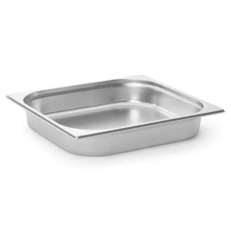 - Standard GN 2/3 – pojemnik pasuje do większości urządzeń gastronomicznych, takich jak bemary, witryny chłodnicze czy piece konwekcyjno-parowe, co czyni go wszechstronnym narzędziem pracy w kuchni.