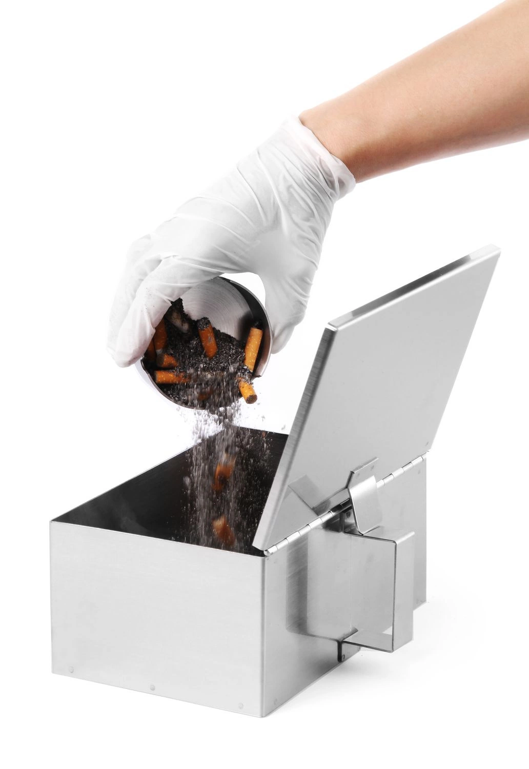 Pojemnik na popiół z podnoszoną pokrywką.