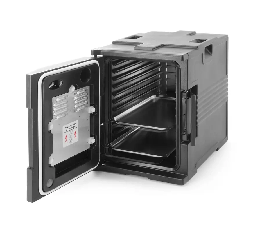 - Funkcja podgrzewania elektrycznego – wbudowany system grzewczy pozwala na wydłużenie czasu utrzymywania ciepła, co jest nieocenione podczas wielogodzinnych eventów, bankietów czy transportu potraw na większe odległości.