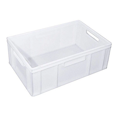 Pojemnik transportowy o wymiarach 60x40x32 cm. Wykonany z białego polietylenu. Bez pokrywy.