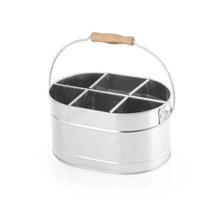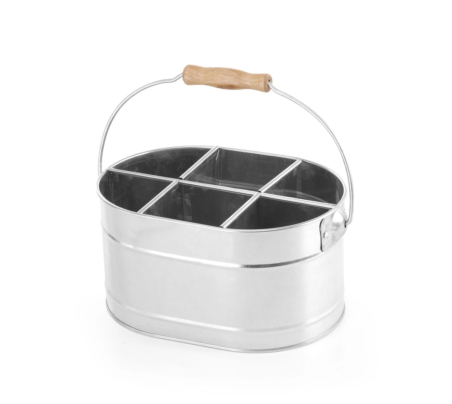 Pojemnik w kształcie wiadra na sztućce i serwetki z drewnianą rączką. Wykonany z ocynkowanej blachy stalowej, w stylu rustykalnym.