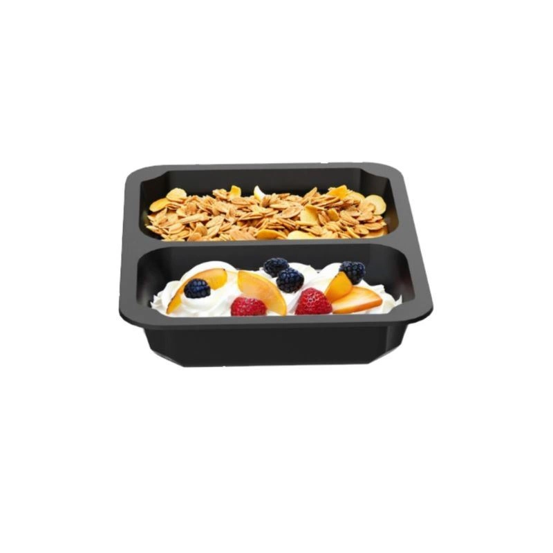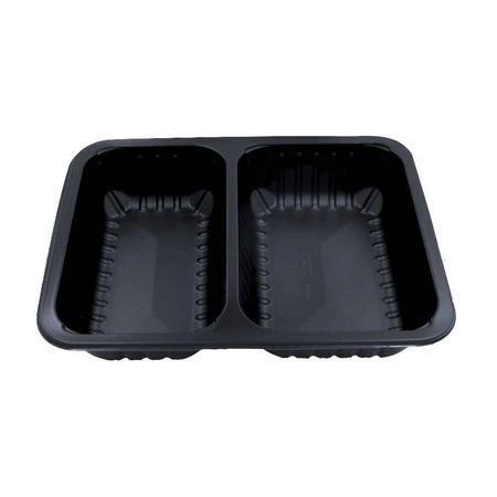 Pojemnik obiadowy 2-komorowy o wymiarach 22,7x17,8x4 cm do dań na wynos. Pojemnik wykonany z czarnego polipropylenu nadającego się do recyklingu. Przeznaczony do zgrzewu dań na wynos w zgrzewarkach.