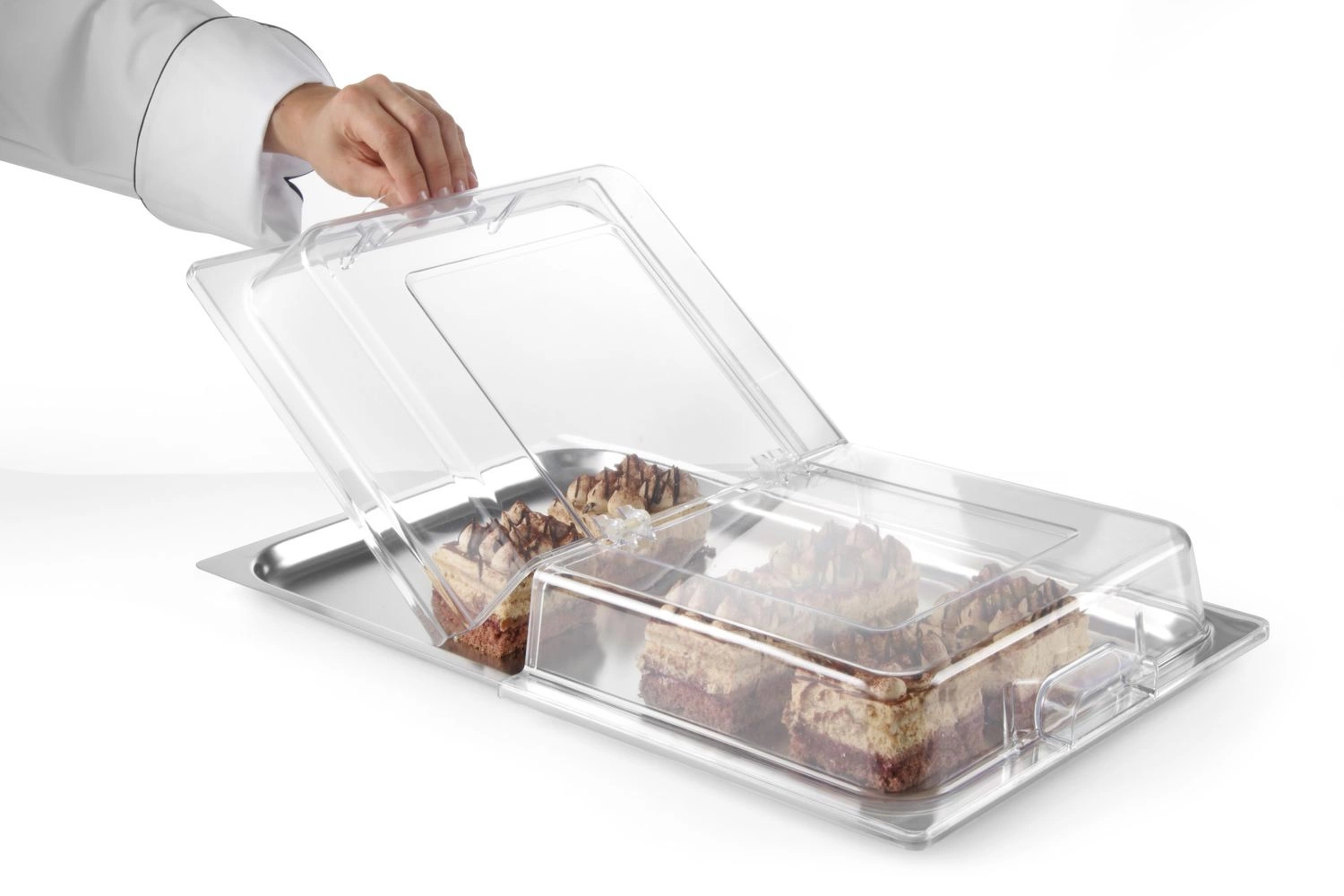 Pokrywa uchylna wykonana z poliwęglanu. Wymiary w standardzie GN 1/1. Nie można myć w zmywarce.