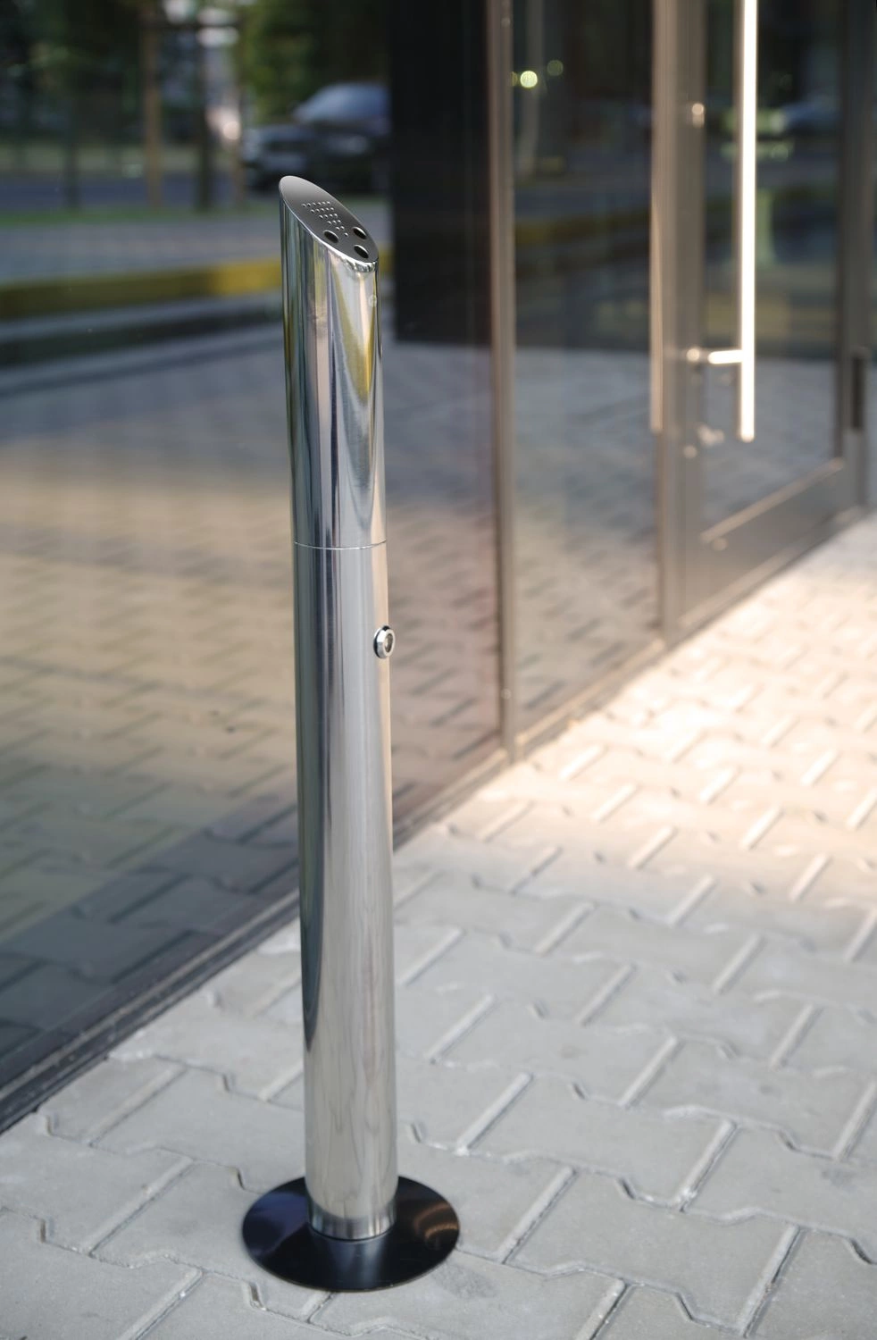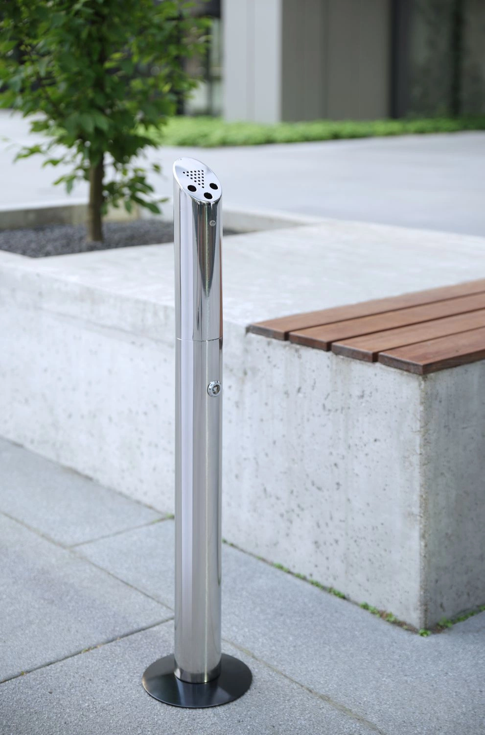 Popielnica stojąca. Solidna konstrukcja, wolno stojąca z możliwością montażu do podłoża. Łatwe opróżnianie popielnicy przez otwierana górna część, zamykana za pomocą klucza.