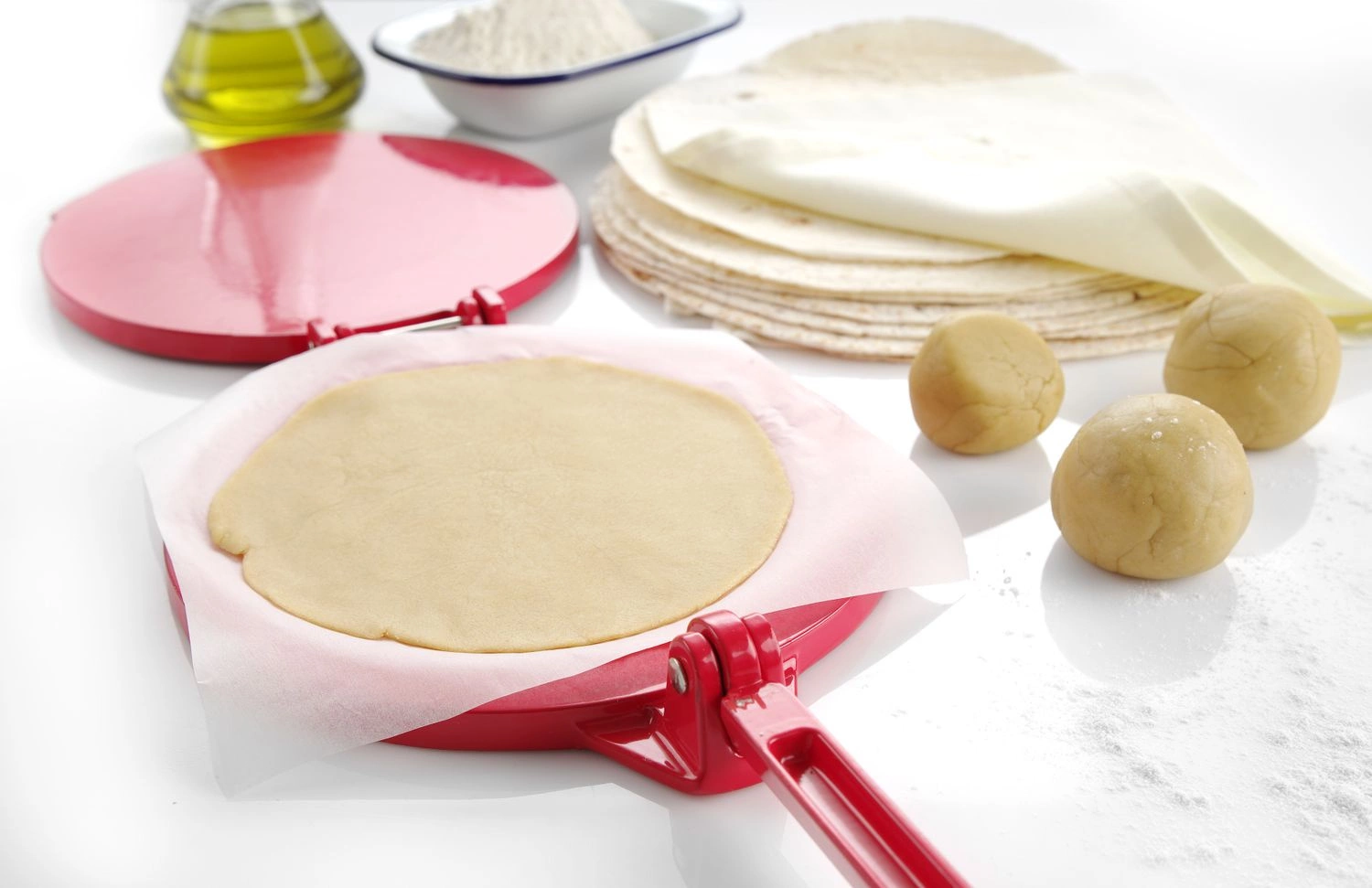 Prasa do tortilli ręczna. Maksymalna średnica tortilli 20 cm. Wykonana ze stopu aluminium malowanego proszkowo na kolor czerwony.