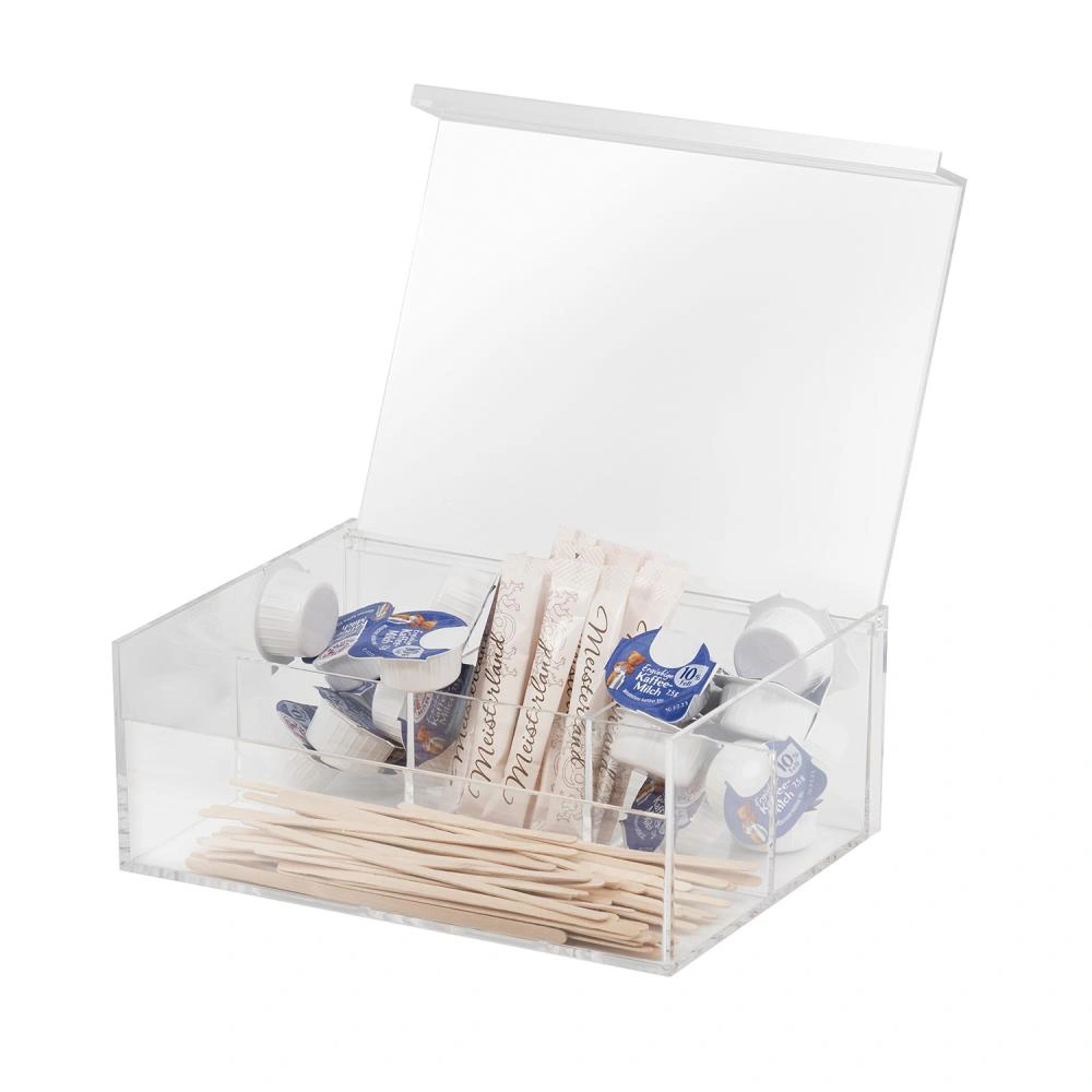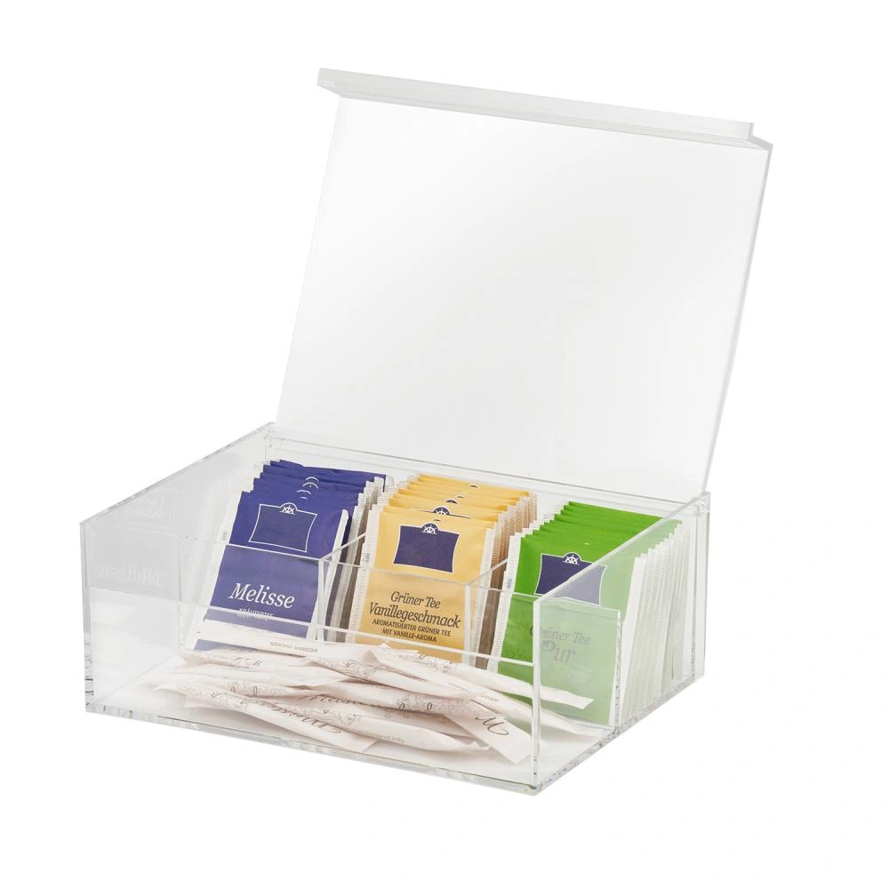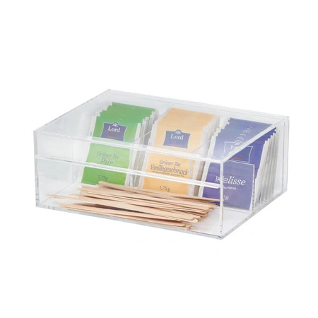 Pudełko świetnie sprawdzi się zarówno w domowej kuchni, jak i na stole w biurze czy restauracji. Dzięki oddzielnym przegródkom pozwala zorganizować różne rodzaje herbat, a także przechowywać cukier lub drobne przekąski, co usprawnia obsługę gości i domowników. Przezroczysta pokrywka umożliwia szybki podgląd zawartości, co jest wygodne podczas serwowania.
