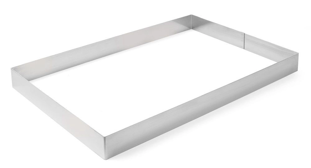 Rant piekarniczo-cukierniczy prostokątny 38.5x28.5 cm. Wykonany ze stali nierdzewnej. Idealny do kształtowania ciast i potraw. Grubość stali nierdzewnej 1,5 mm.