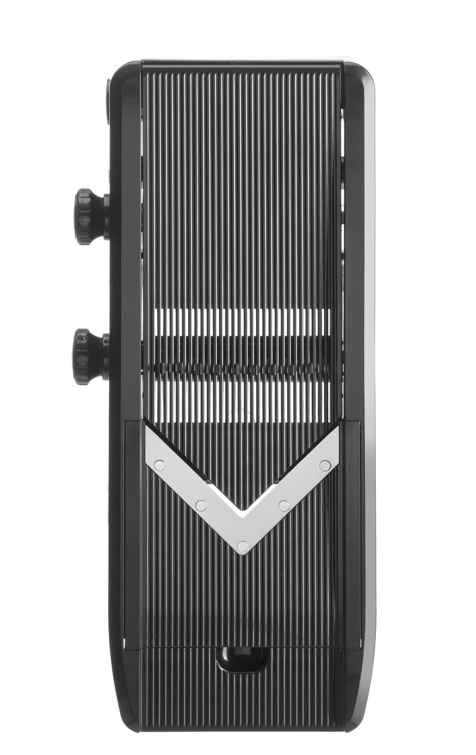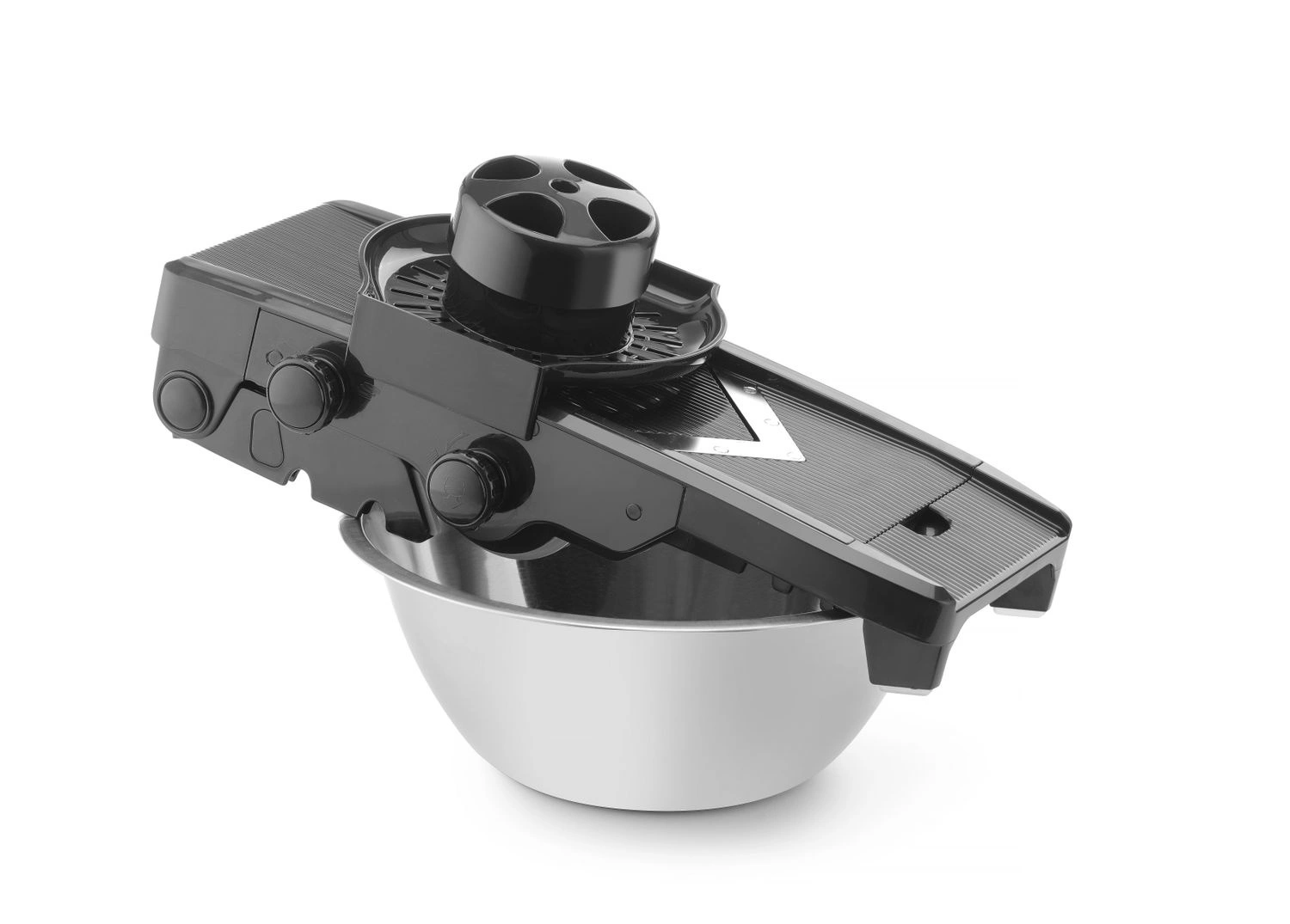 Ręczna szatkownica do warzyw wykonana z twardego tworzywa w kolorze czarnym. Noże - stal nierdzewna. Główne ostrze tnące w kształcie litery V. W zestawie 5 przystawek. Regulacja grubości plastrów od 1 do 9 mm. Możliwość uzyskania dwóch grubości słupków 6 i 9 mm. Bezpieczny element dociskowy z metalowymi bolcami do umocowania warzyw.