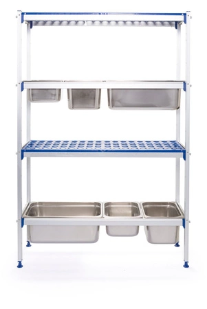 Regał magazynowy aluminiowy na pojemniki GN. Główną zaletą regału jest możliwość umieszczania w nim pojemników GN 1/1 bezpośrednio na poprzeczkach regału zamiast na półkach. Rama regału wykonana jest z anodowanego aluminium, półki natomiast wykonane z polipropylenu - z łatwością możne je myć w zmywarce. Maksymalne równomierne obciążenie to 150 kg na każdą półkę.