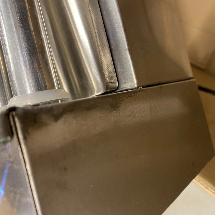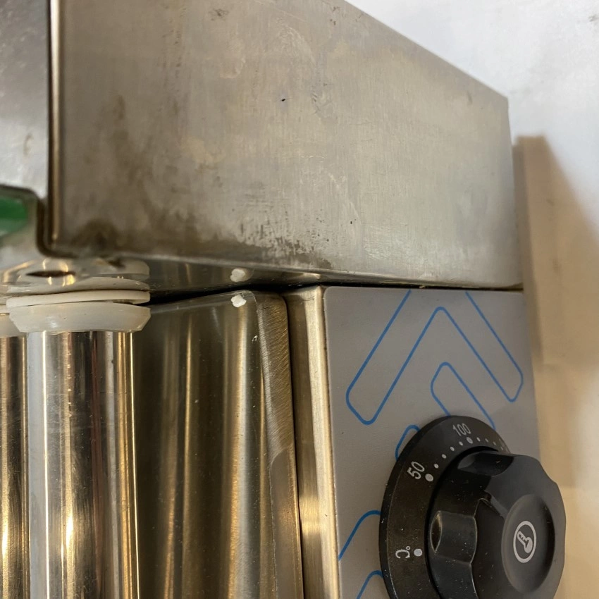 Opiekacz był używany na prezentacjach dla klientów- posiada widoczne na zdjęciach rysy, plamy oraz czarne ślady- wady produkcyjne.