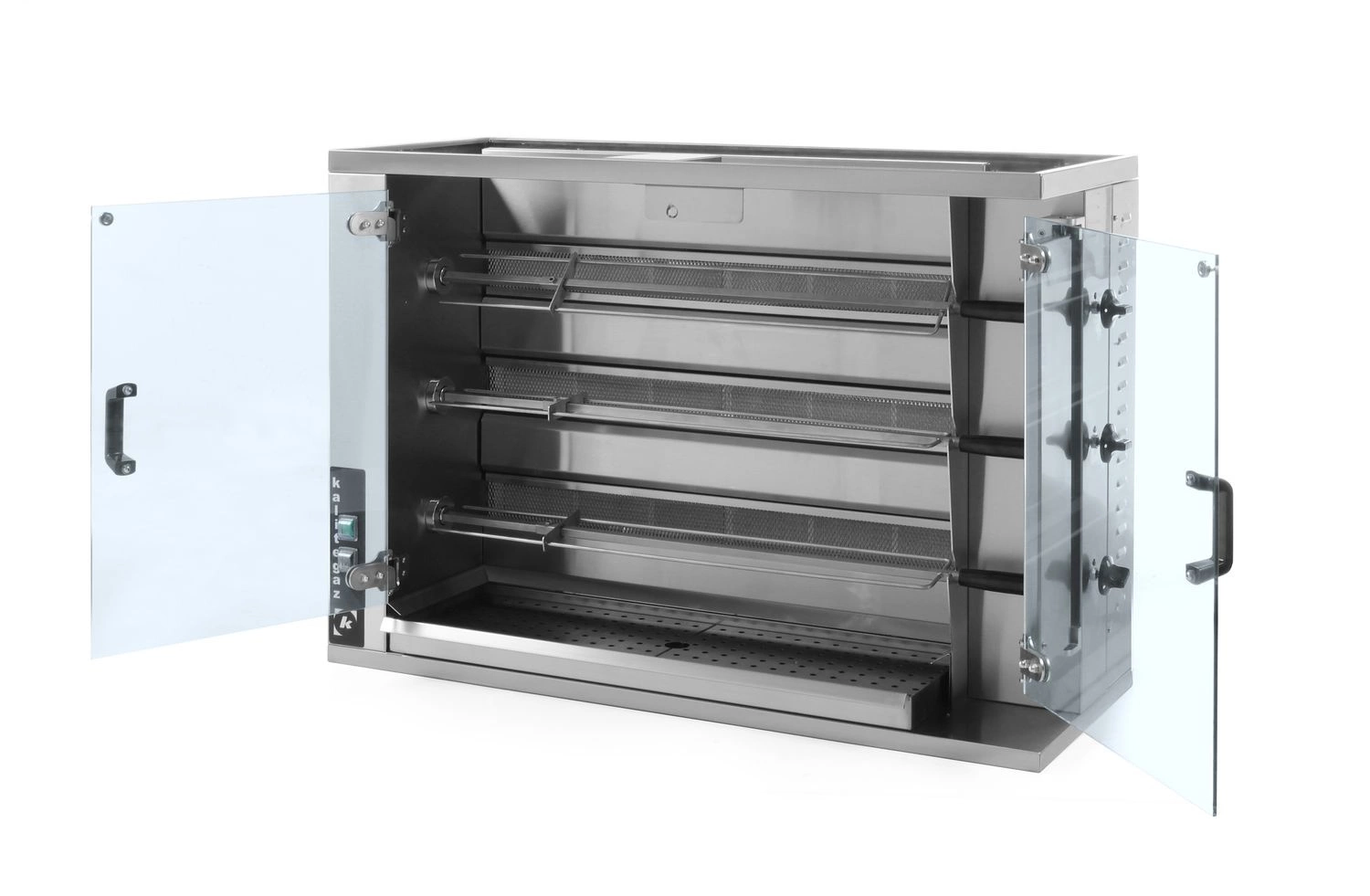 Rożen gazowy do kurczaków o pojemności 12/15 sztuk. Obudowa urządzenia ze stali nierdzewnej, drzwi skrzydłowe z hartowanego szkła. Prawe drzwi otwierane wraz z częścią prawej obudowy dla ułatwienia wkładania rusztów. Długość rożna z uchwytem: 950 mm, długość użytkowa rożna: 740 mm. Przekrój rożna: 12×12 mm. Silniczek elektryczny obracający rożnami: 30 W/230 V. Oświetlenie komory. Model 226070 posiada 3 obrotowe rożna, każde na 4-5 kurczaków, 3 niezależne strefy grzewcze.