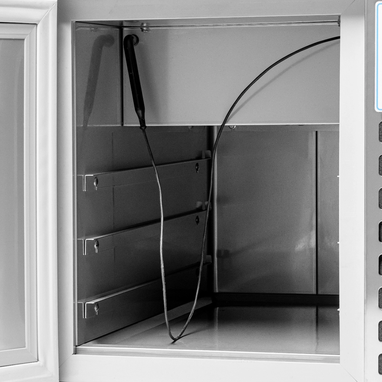 Korpus urządzenia wykonany jest z wysokogatunkowej stali nierdzewnej, co zapewnia trwałość, odporność na uszkodzenia i łatwość czyszczenia. Drzwi wyposażone w wygodny uchwyt na całej długości ułatwiają codzienną obsługę, a samozamykający się mechanizm minimalizuje straty energii. Cyfrowy panel sterowania umożliwia łatwe ustawianie parametrów pracy, a dołączona sonda rdzeniowa pozwala na precyzyjne monitorowanie temperatury wewnątrz produktów. W skład zestawu wchodzi schładzarko-zamrażarka z kompletem prowadnic do pojemników GN 1/1.