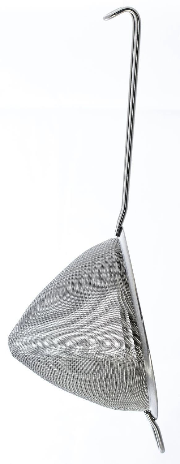 Sito chińskie z dodatkową rączką, wykonane ze stali nierdzewnej, perforowane, stożkowe. Średnica 18 cm.