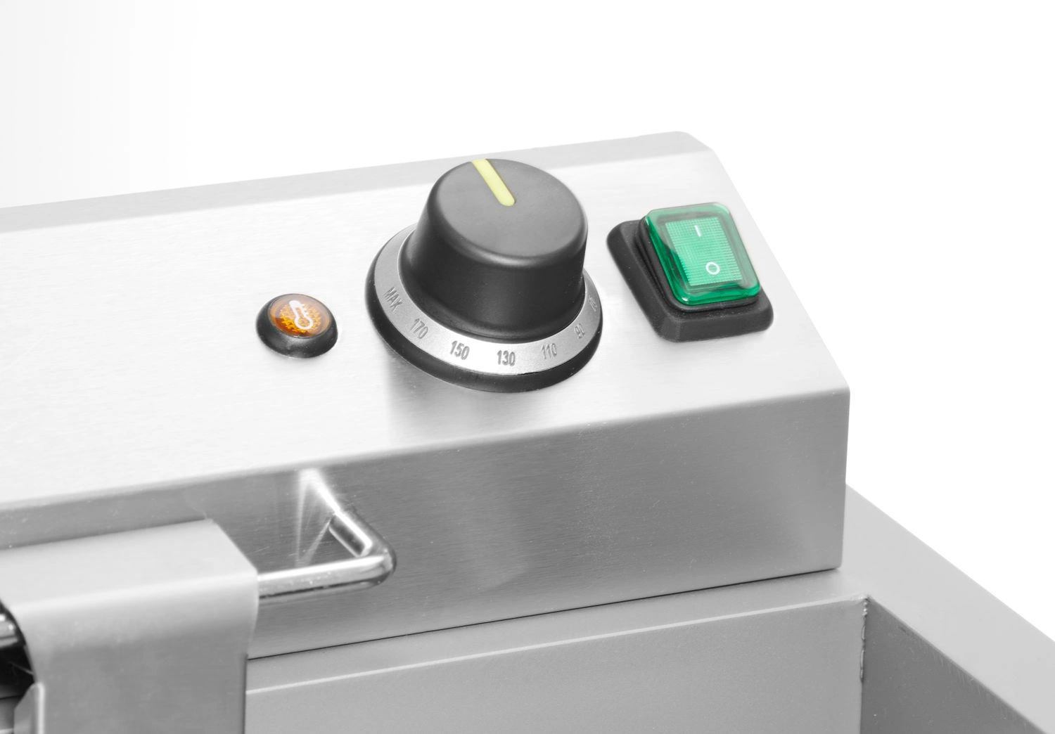 - Regulacja temperatury od 50 do 190°C – umożliwia precyzyjne ustawienie parametrów smażenia w zależności od rodzaju produktów i wymagań receptury.