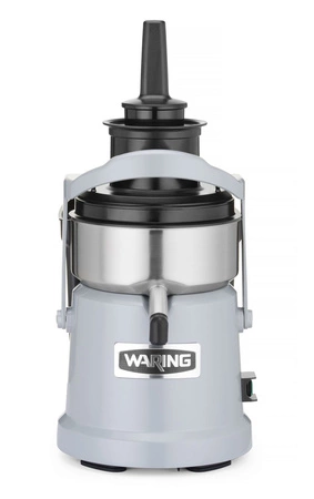 Sokowirówka do owoców i warzyw marki Waring Commercial. Przeznaczona zarówno do miękkich jak i twardych owoców i warzyw. Zaprojektowana do pracy ciągłej, doskonale sprawdzi się do przygotowywania świeżych soków w barach, sklepach i stoiskach ze świeżymi sokami. Pod obudową znajduje się wytrzymały, bezszczotkowy silnik o mocy 1,2 KM. Otwór wsadowy o śr. ok. 8,1 cm umożliwia dodawanie składników podczas pracy urządzenia. Obudowa silnika odlewana ze stali pod ciśnieniem i malowana proszkowo. Sokowirówka odrzuca miąższ do dużego, 12-litrowego pojemnika, dołączonego do zestawu. W zestawie znajduje się także popychacz do owoców i warzyw. Wysoko zamontowana wylewka pozwala na ustawienie kubka lub słoika o pojemności nawet 1,2 litra. Urządzenie wyposażone w przyssawki, które zapobiegają przesuwaniu się podczas pracy. Po prawej stronie urządzenia znajduje się przełącznik zasilający.