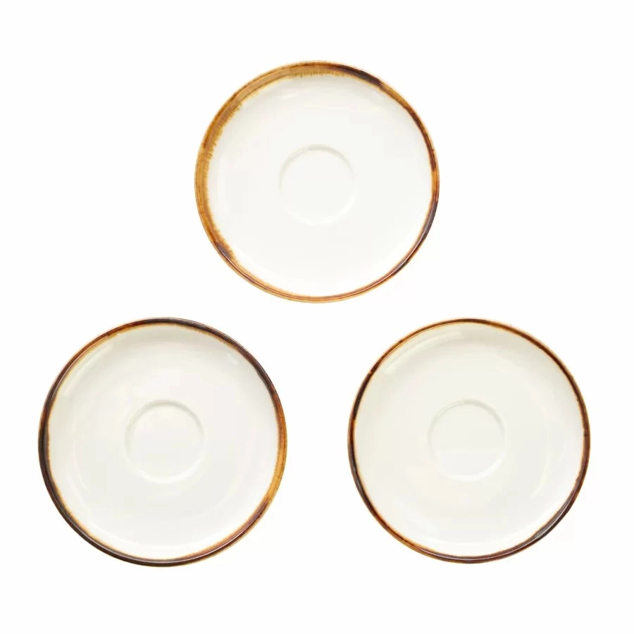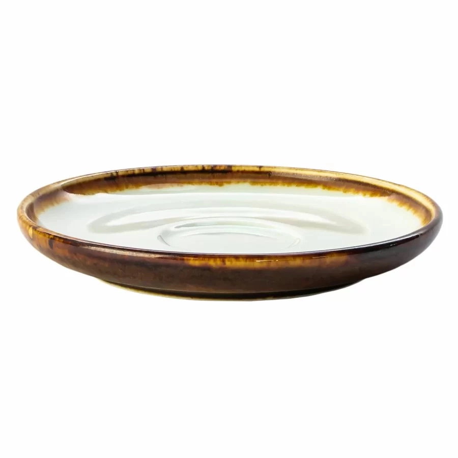 Spodek VERLO z linii SLOW to idealne uzupełnienie filiżanki do espresso, tworząc harmonijny i elegancki zestaw. Charakteryzuje się połączeniem kontrastujących barw oraz szkliwa o wysokim połysku, co nadaje mu wyrazisty i niepowtarzalny wygląd. Zewnętrzna powierzchnia spodka, podobnie jak filiżanka, zdobiona jest subtelnymi przebarwieniami uzyskanymi dzięki zastosowaniu szkliwa reaktywnego, które tworzy nieregularne dekoracje na jego powierzchni. Brązowo-rdzawa barwa delikatnie przechodzi w chłodny odcień „lodowatej” bieli, tworząc wyjątkowy efekt przenikania kolorów. Ręczne wykończenie spodka nadaje mu unikalny charakter, co czyni każdy egzemplarz wyjątkowym. Mocna, solidna forma oraz grubość porcelany podkreślają jego rustykalny, a zarazem nowoczesny styl, idealny do wnętrz restauracyjnych, jak i domowych aranżacji.