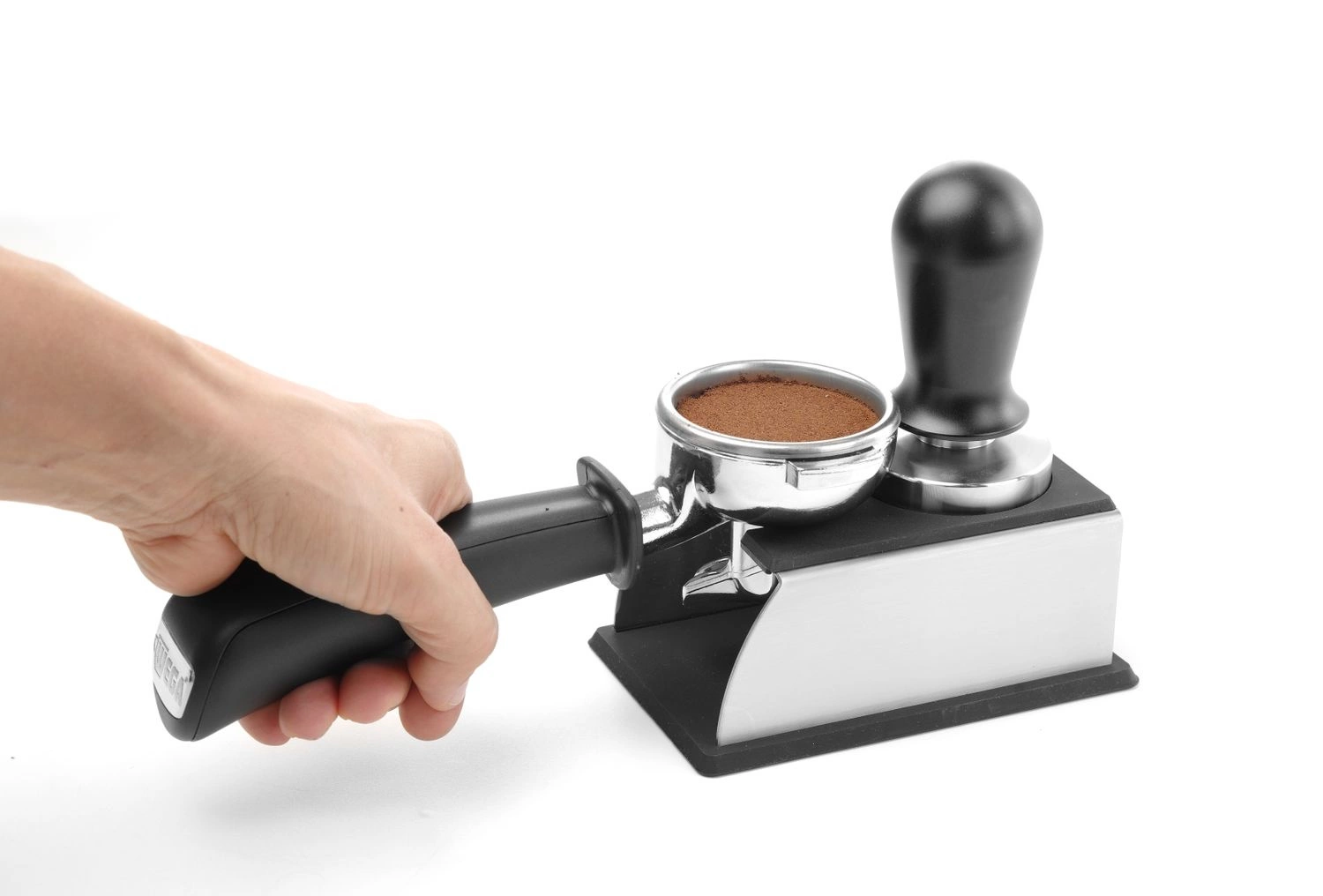 - Wycięcie na kolbę – specjalnie zaprojektowane miejsce pozwala na stabilne oparcie kolby, co ułatwia precyzyjne ubijanie kawy bez ryzyka przesunięcia czy wywrócenia akcesoriów.