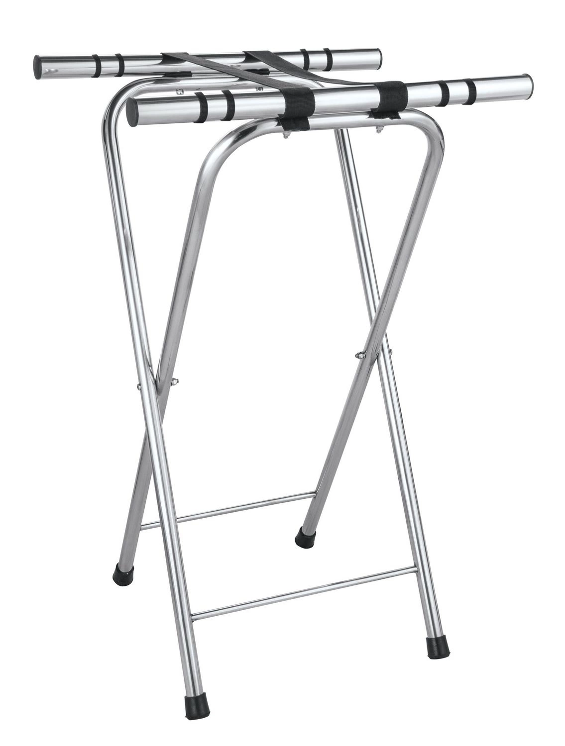 Składany stojak do tac. Wykonany z wysokiej jakości materiałów. Stabilna, mocna konstrukcja. Wyposażony w czarne pasy, łatwy w montażu.