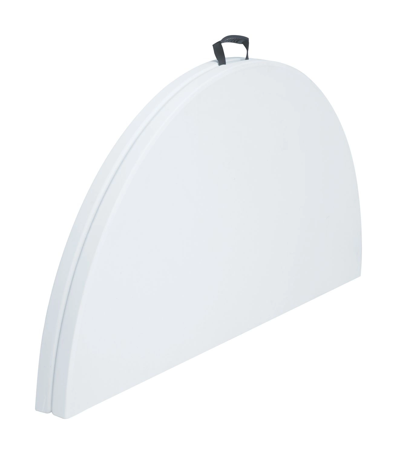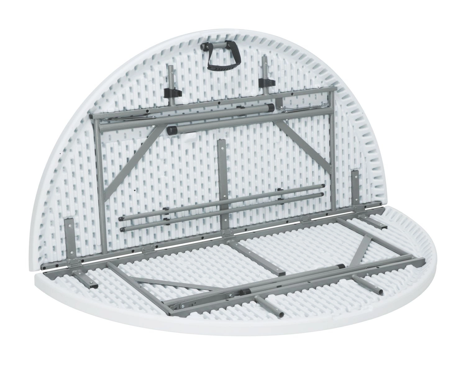 Stół cateringowy okrągły o wymiarach średnicy 150 cm. Przeznaczony do użytku na zewnątrz i wewnątrz pomieszczeń. Blat wykonany z polietylenu HDPE co ułatwia czyszczenie. Konstrukcja wykonana z metalu malowanego proszkowo. Stół składany do formatu walizki, co pozwala na łatwe magazynowanie oraz kg. transport. Maksymalne obciążenie stołu wynosi 150 kg.