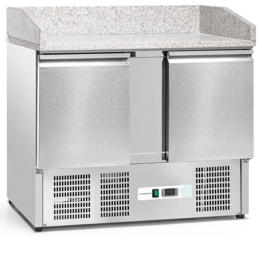 Stół chłodniczy 2-drzwiowy do pizzy marki Forgast to profesjonalne urządzenie chłodnicze przeznaczone do intensywnego użytkowania w gastronomii, szczególnie w pizzeriach i restauracjach serwujących dania na zimno. Jego charakterystyczne cechy to pojemny, dwudrzwiowy korpus wykonany ze stali nierdzewnej oraz solidny blat granitowy z wysokim rantem, idealny do przygotowywania ciasta i składania pizzy. Urządzenie zapewnia odpowiednie warunki przechowywania składników, a także wygodną i higieniczną przestrzeń roboczą.