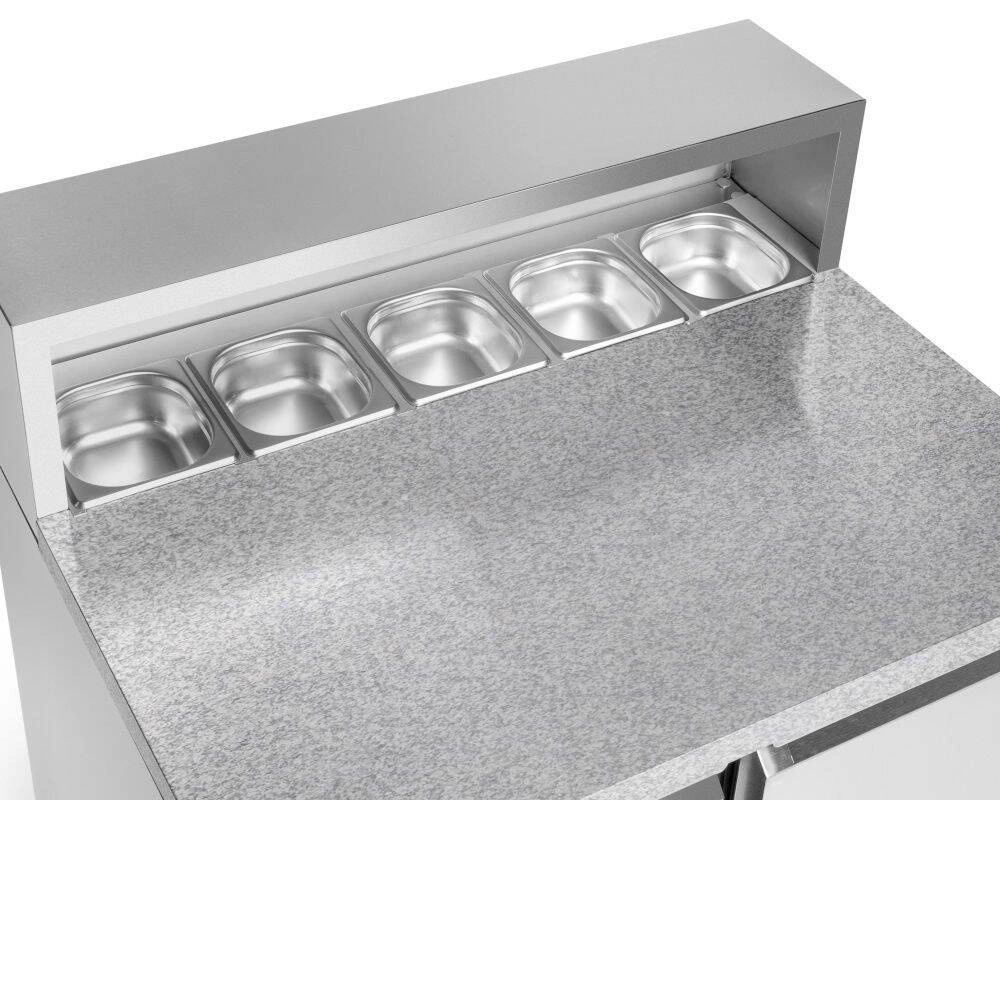 - Chłodzona nadstawka – pozwala na wygodne rozmieszczenie do pięciu pojemników GN 1/6, co ułatwia organizację składników do pizzy i innych potraw, zapewniając ich świeżość przez cały czas pracy.
