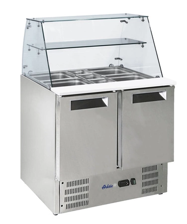 Stół chłodniczy 2-drzwiowy sałatkowy z nadstawą szklaną to profesjonalne urządzenie chłodnicze, idealne do przechowywania i prezentacji składników sałatek oraz innych produktów spożywczych wymagających kontroli temperatury. Model ten wyróżnia się solidną konstrukcją ze stali nierdzewnej oraz funkcjonalną nadstawką z dodatkową półką, pozwalającą na wygodne eksponowanie pojemników z żywnością. Doskonale sprawdzi się w restauracjach, barach sałatkowych, hotelach czy punktach gastronomicznych.