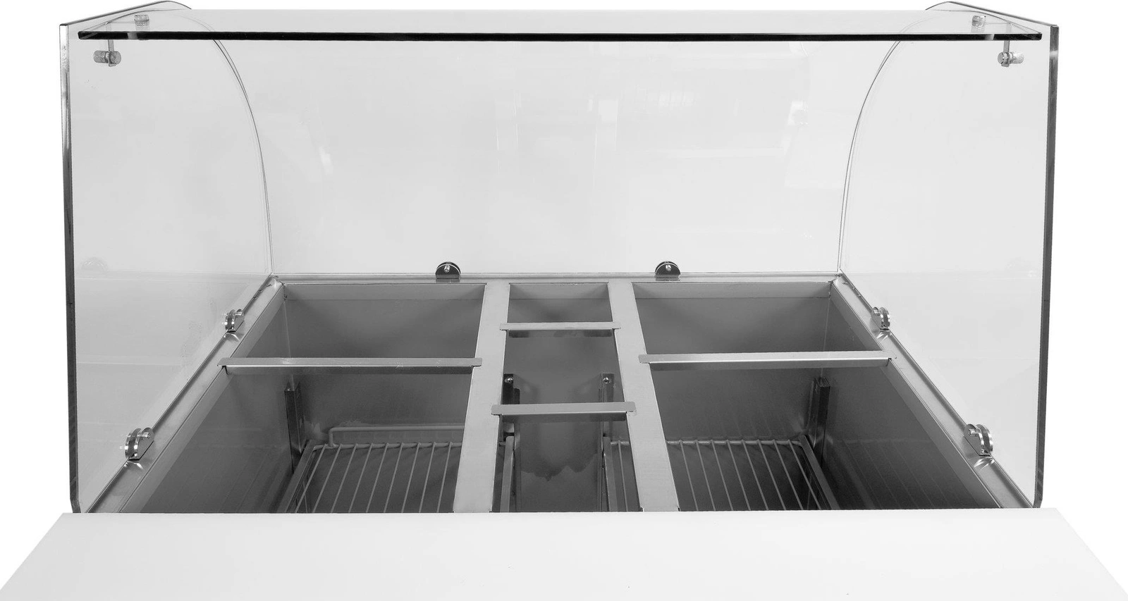 Stół chłodniczy 2-drzwiowy sałatkowy z nadstawką szklaną wykonaną ze szkła hartowanego o pojemności 240 l oraz o wymiarach 90x70x85 cm marki YATO. Zaprojektowany z myślą o przechowywaniu żywności w zakresie temperatur od +2°C do +8°C. Obudowa zewnętrzna i wewnętrzna wykonana z wysokiej jakości stali nierdzewnej 201 gwarantuje elegancki wygląd, a jednocześnie jest bardzo łatwa w utrzymaniu w czystości. Blat posiada dodatkowo uchylną pokrywę górną wykonaną ze stali nierdzewnej. Stół został wyposażony w uchylne, samozamykające się drzwi z ergonomicznymi uchwytami, a każde z drzwi ma w zestawie po jednej półce rusztowej (32,5x56 cm) powleczonej PVC o nośności maksymalnej 40kg przy równomiernym obciążeniu. Model ten umożliwia także przechowywanie pojemników GN 1/1.