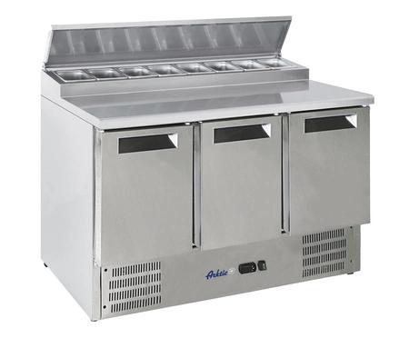Stół chłodniczy 3-drzwiowy sałatkowy z nadstawą to profesjonalne urządzenie przeznaczone do przechowywania oraz ekspozycji składników w gastronomii. Charakteryzuje się dużą pojemnością oraz wygodną nadstawką pozwalającą na łatwe przygotowywanie potraw. Idealnie sprawdzi się w restauracjach, barach sałatkowych czy punktach szybkiej obsługi.