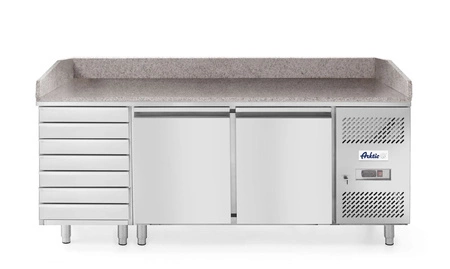Stół chłodniczy do pizzy 2-drzwiowy z 7 szufladami i blatem granitowym. Obudowa wewnętrzna i zewnętrzna z wysokogatunkowej stali nierdzewnej. Cyfrowy wyświetlacz, elektroniczny termostat, agregat chłodniczy EMBRACO.