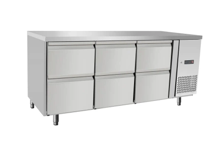 Stół chłodniczy z 6 szufladami GN 1/1 to profesjonalne urządzenie przeznaczone do przechowywania produktów spożywczych w warunkach chłodniczych, idealne dla gastronomii, restauracji i hoteli. Wyróżnia się wysoką funkcjonalnością dzięki obecności sześciu pojemnych szuflad oraz bocznie umieszczonemu agregatowi chłodniczemu. To sprzęt dedykowany do intensywnej pracy w kuchniach, gdzie liczy się szybki dostęp do świeżych składników i ergonomiczna organizacja miejsca pracy.