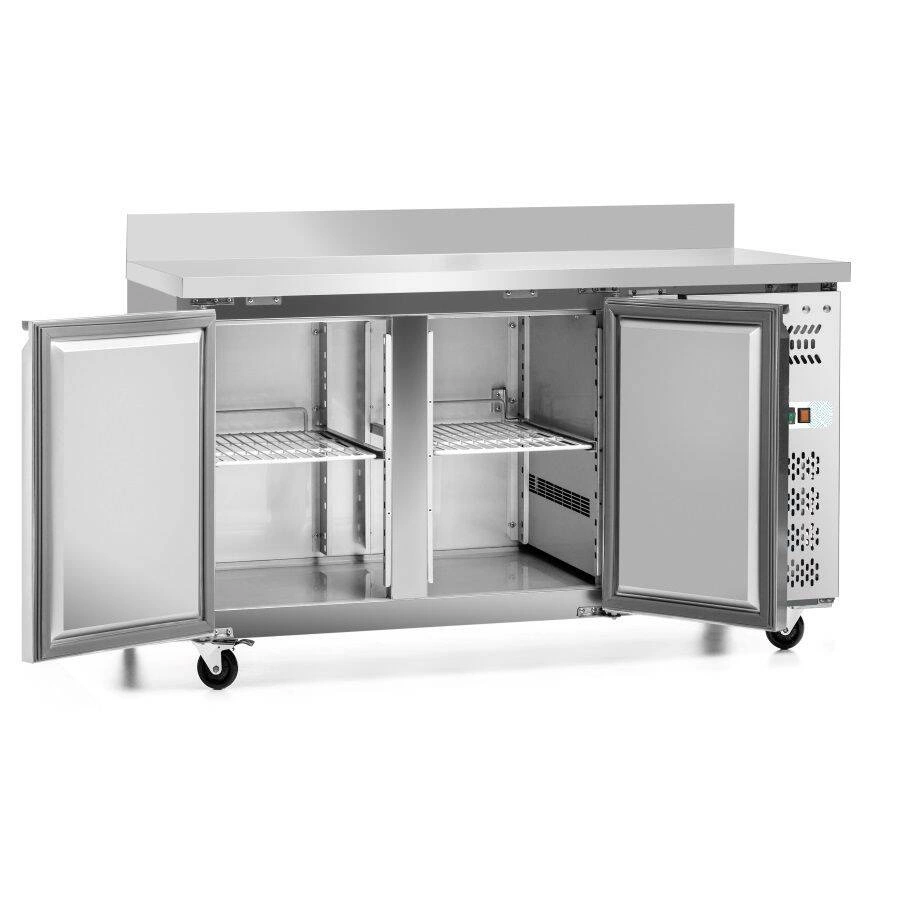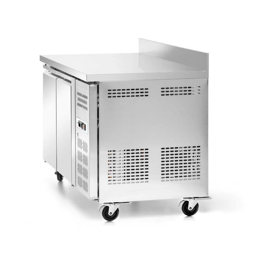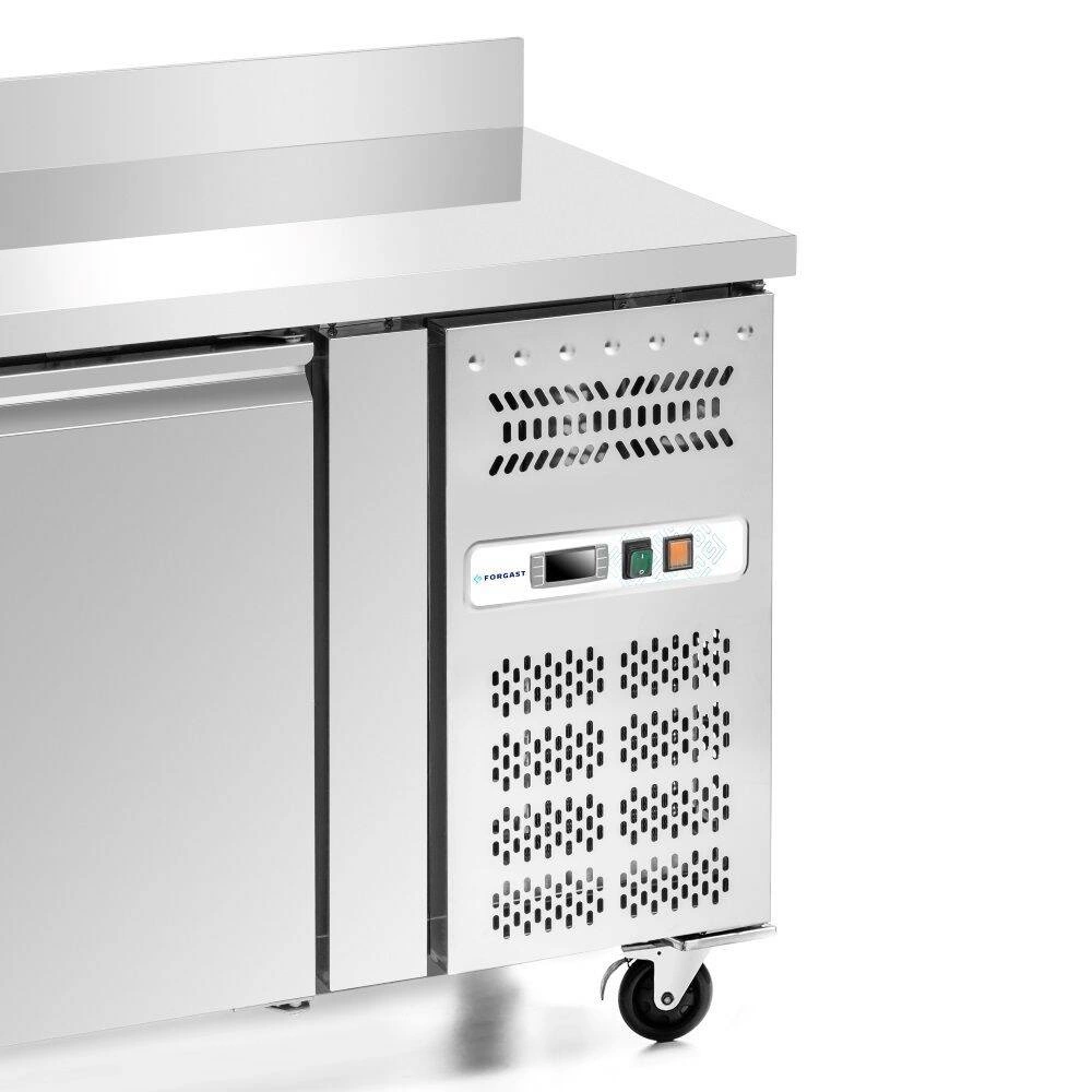 Stół mroźniczy FORGAST FG08202 został zaprojektowany z myślą o wygodzie użytkownika oraz utrzymaniu najwyższych standardów higieny. Blat roboczy ze stali nierdzewnej posiada praktyczny tylny rant o wysokości 10 cm, który zabezpiecza ścianę przed zabrudzeniami i ułatwia utrzymanie czystości. Zaokrąglone narożniki komory wewnętrznej umożliwiają szybkie i skuteczne mycie, eliminując miejsca gromadzenia się zanieczyszczeń. Urządzenie wyposażono w kółka, które umożliwiają łatwe przemieszczanie stołu nawet w pełni załadowanego, co jest szczególnie przydatne podczas reorganizacji przestrzeni kuchennej lub prac porządkowych. Profesjonalny elektroniczny sterownik Dixell z wyświetlaczem pozwala na precyzyjną kontrolę temperatury, a agregat renomowanej marki Embraco zapewnia niezawodną pracę nawet przy intensywnym użytkowaniu.