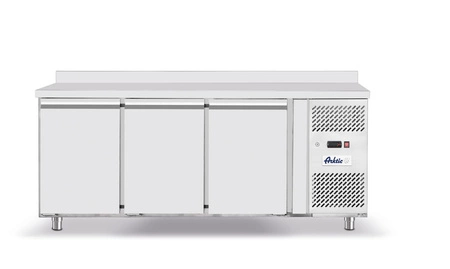 Korpus stołu wykonany jest z trwałej stali nierdzewnej, co zapewnia odporność na korozję oraz łatwość czyszczenia. Boczne umieszczenie agregatu chłodniczego (EMBRACO) pozwala na efektywną wymianę powietrza i prostą konserwację. Każde z trzech drzwi wyposażone jest w półkę o dużej nośności, umożliwiając przechowywanie ciężkich produktów. Automatyczne odparowanie skroplin oraz filtr przeciwpyłkowy zmniejszają częstotliwość obsługi serwisowej, a cyfrowy wyświetlacz i elektroniczny termostat pozwalają na precyzyjne sterowanie temperaturą.