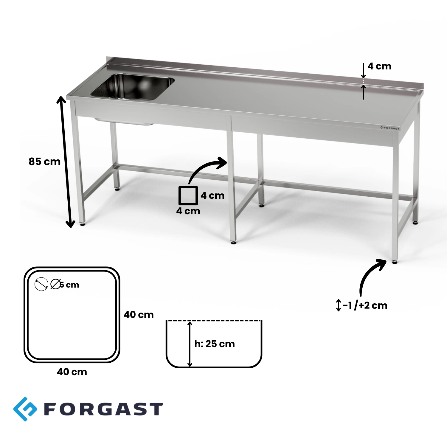 Wybierając stół nierdzewny ze zlewem 1-komorowym 170x60x85 cm marki FORGAST, inwestujesz w trwałość, funkcjonalność oraz bezpieczeństwo pracy w kuchni. Solidne wykonanie z wysokiej klasy stali nierdzewnej, możliwość indywidualnej konfiguracji oraz przemyślane detale, takie jak wyprofilowany blat czy regulowane stopki, sprawiają, że jest to rozwiązanie idealne dla profesjonalistów ceniących sobie wygodę i niezawodność. Ten produkt to gwarancja higieny, łatwego utrzymania czystości oraz długowieczności nawet w najbardziej wymagających warunkach gastronomicznych.