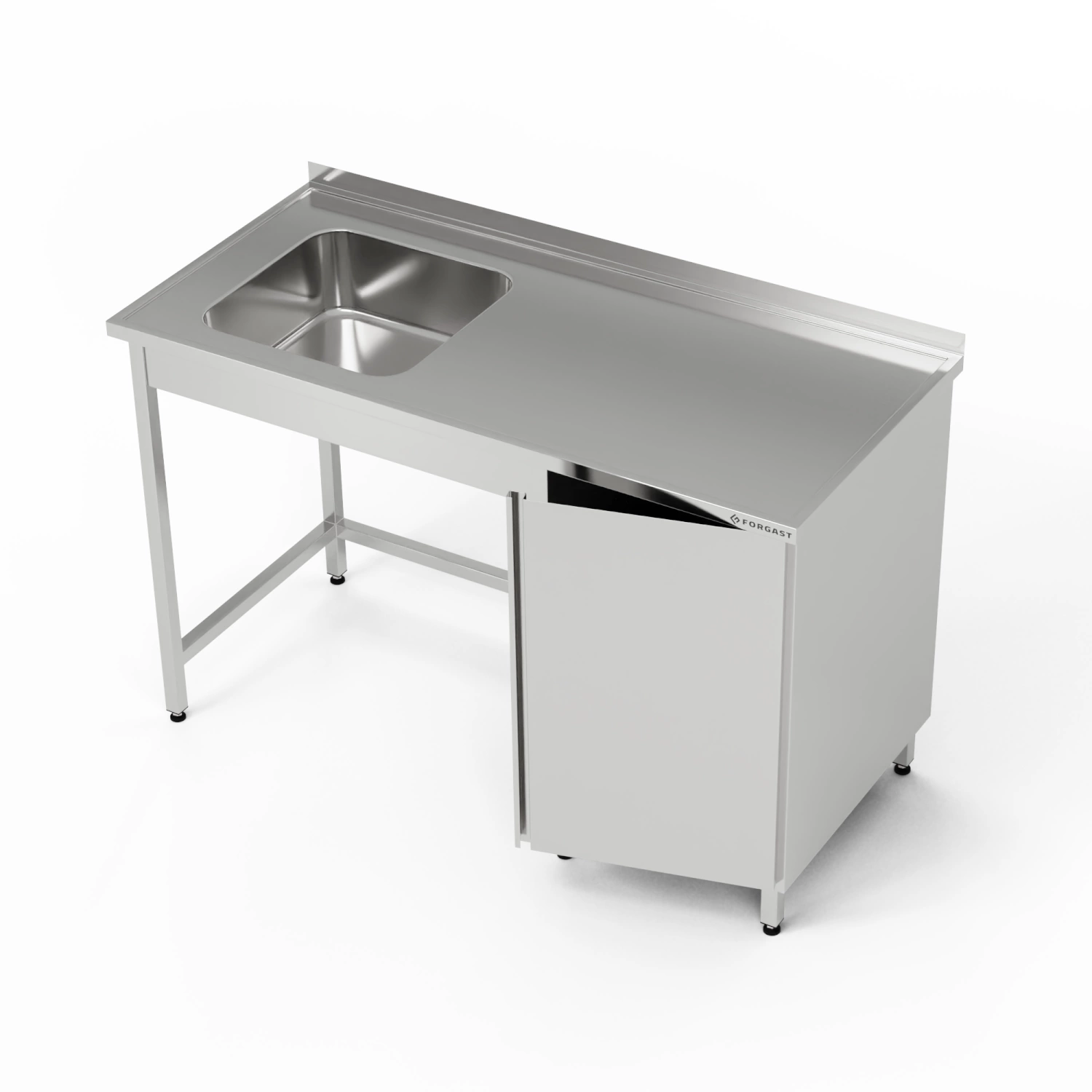 Stół FORGAST wyposażony jest w jedną dużą komorę zlewu oraz pojemną szafkę z drzwiami otwieranymi, co pozwala na wygodne przechowywanie akcesoriów lub środków czystości. Blat posiada specjalny profil o wysokości 4 mm, który skutecznie zabezpiecza przed ściekaniem wody poza obrys mebla. Stelaż opiera się na kształtownikach o profilu zamkniętym, co zapewnia wysoką stabilność całej konstrukcji. W skład zestawu wchodzi stół ze zlewem, szafka z drzwiami otwieranymi oraz fabrycznie wykonane otwory pod baterię i odpływ. Opcjonalnie możliwe jest zamówienie większego otworu pod rozdrabniacz oraz dodatkowych rantów bocznych.