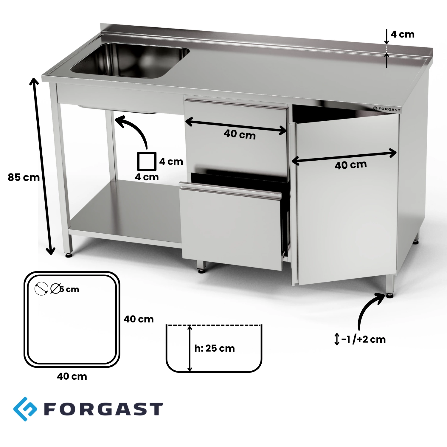 Stół wykonany jest w całości ze stali nierdzewnej J4, co czyni go odpornym na korozję i uszkodzenia mechaniczne. Konstrukcja obejmuje jedną komorę zlewu o dużej głębokości, pojemną szafkę z drzwiami otwieranymi, blok dwóch szuflad oraz dolną półkę, która zwiększa funkcjonalność i umożliwia przechowywanie różnego rodzaju wyposażenia kuchennego. Blat stołu został dodatkowo wyprofilowany na 4 mm, co zapobiega spływaniu wody poza mebel i ułatwia utrzymanie czystości.