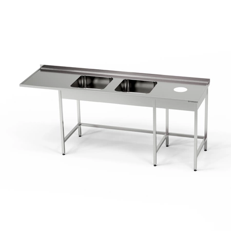 Stół nierdzewny ze zlewem 2-komorowym, miejscem na zmywarkę i otworem na odpadki 230x70x85 cm FORGAST