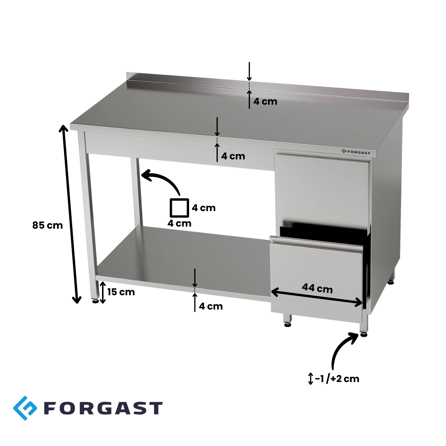 Stół roboczy nierdzewny z blokiem szuflad i półką dolną 120x60x85 cm | FORGAST