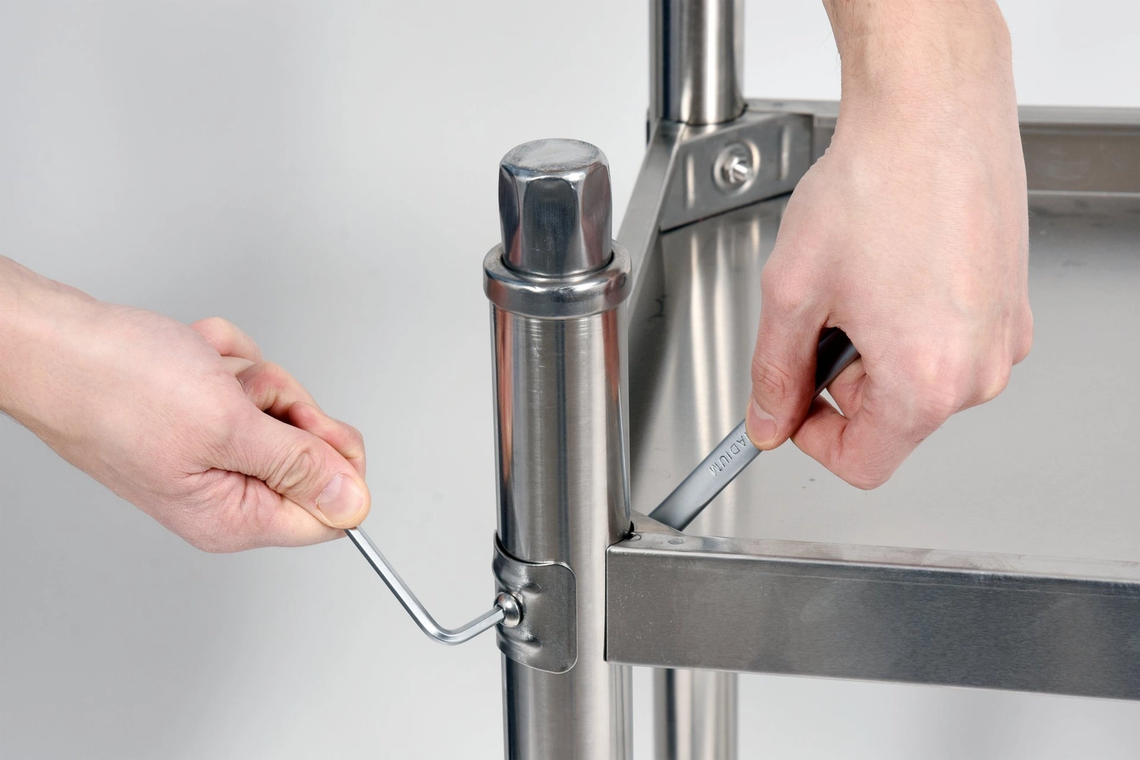 Półka dolna, zamocowana solidnie pod blatem, znacząco zwiększa funkcjonalność stołu, umożliwiając pełne wykorzystanie przestrzeni roboczej. Jej nośność wynosząca do 35 kg pozwala na przechowywanie podręcznych naczyń i urządzeń, co sprzyja efektywnej organizacji stanowiska pracy. Nogi stołu, wykonane z okrągłych profili, posiadają regulację wysokości w zakresie +/-15 mm, co umożliwia wypoziomowanie stołu nawet na nierównych podłożach. Podkładki plastikowe, zamontowane na nogach, zabezpieczają podłogę przed zarysowaniami, dbając jednocześnie o estetykę otoczenia.